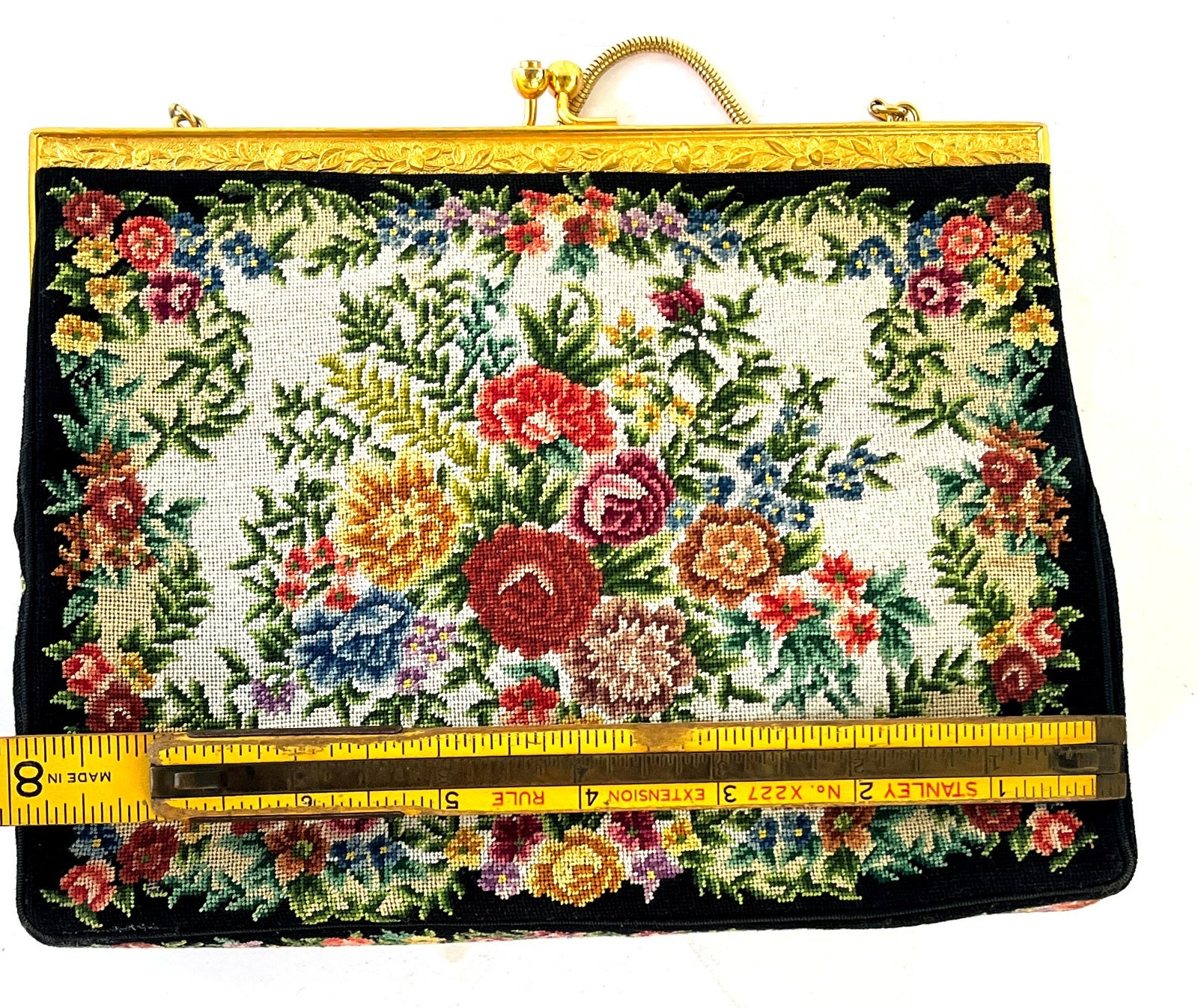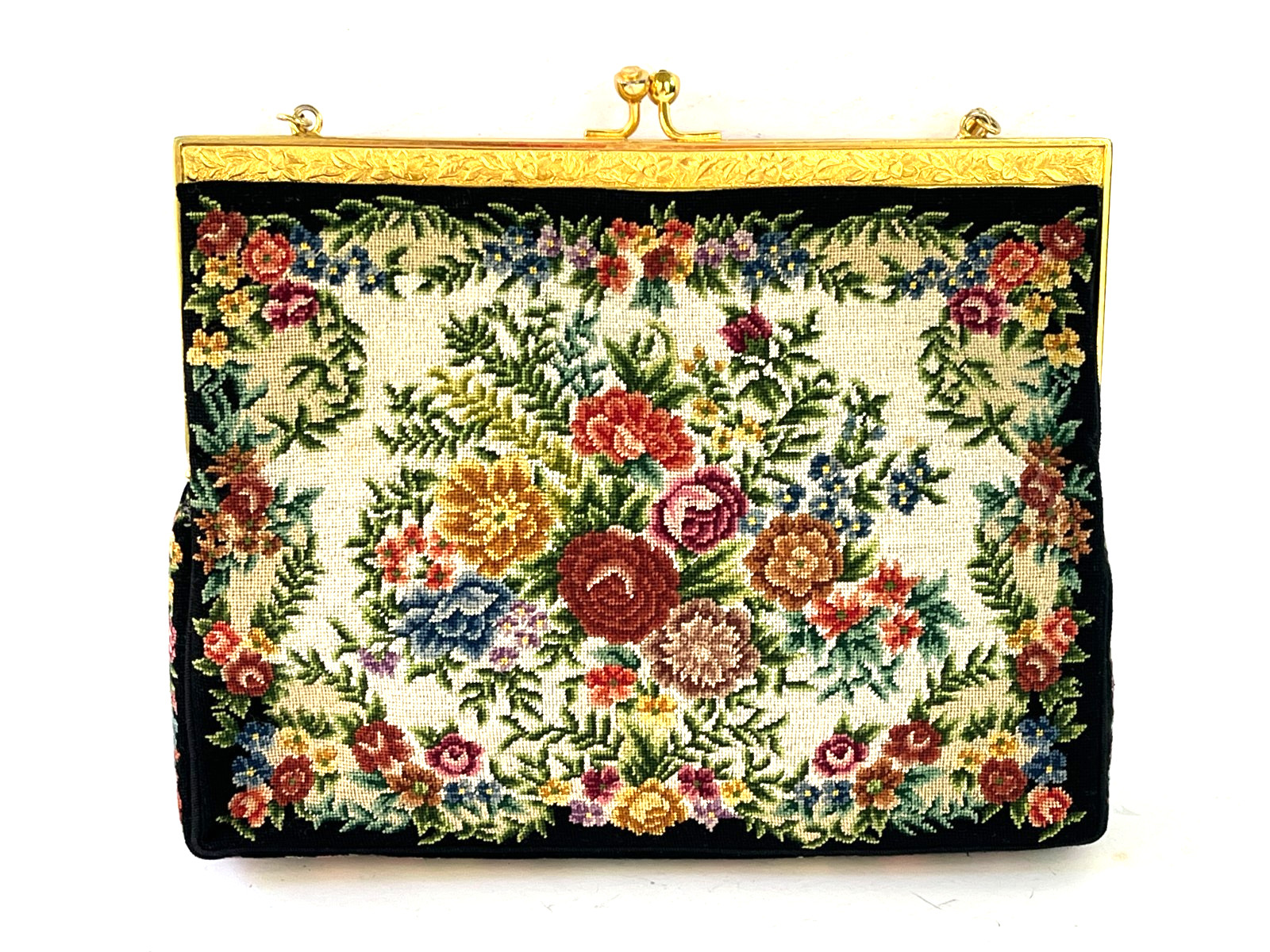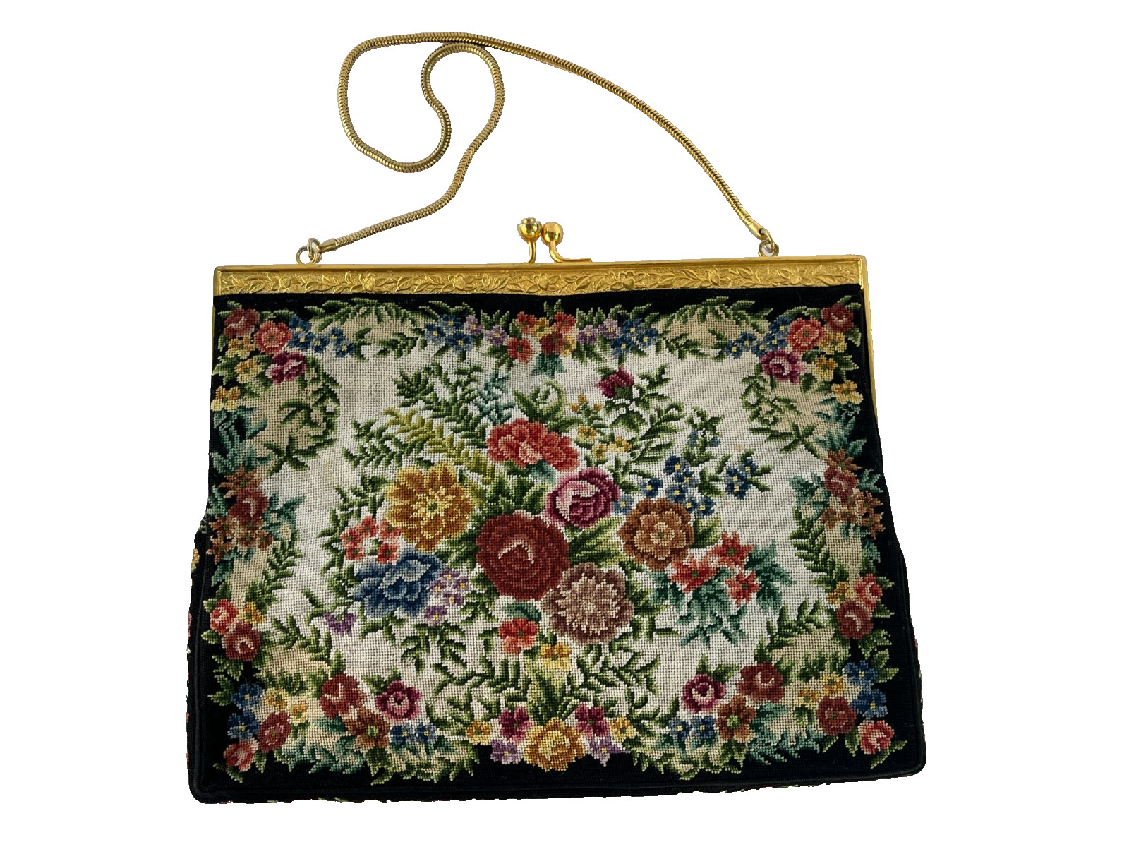 Petit Point Floral Needlepoint Tapestry Embroidery Purse Handbag BLACK Vintage