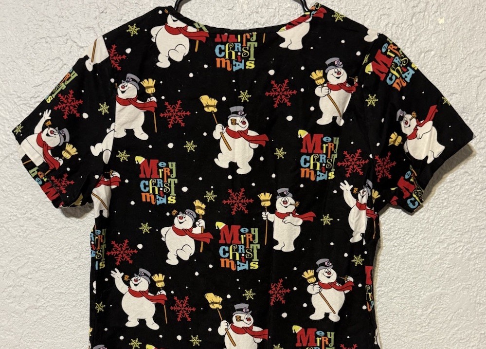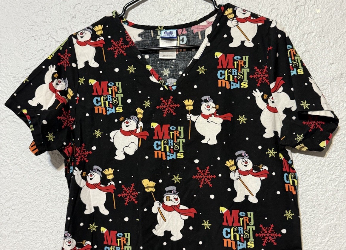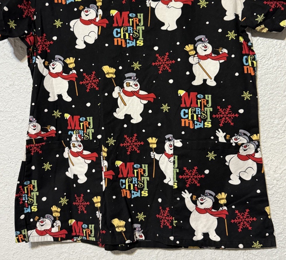 как выглядит Frosty the Snowman Black Scrub Top Womens Small Merry Christmas фото