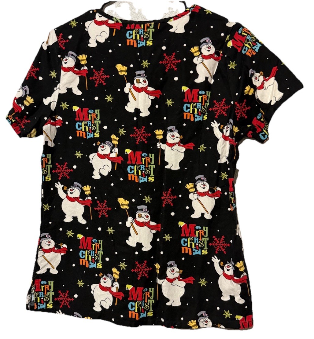 Frosty the Snowman Black Scrub Top Womens Small Merry Christmas