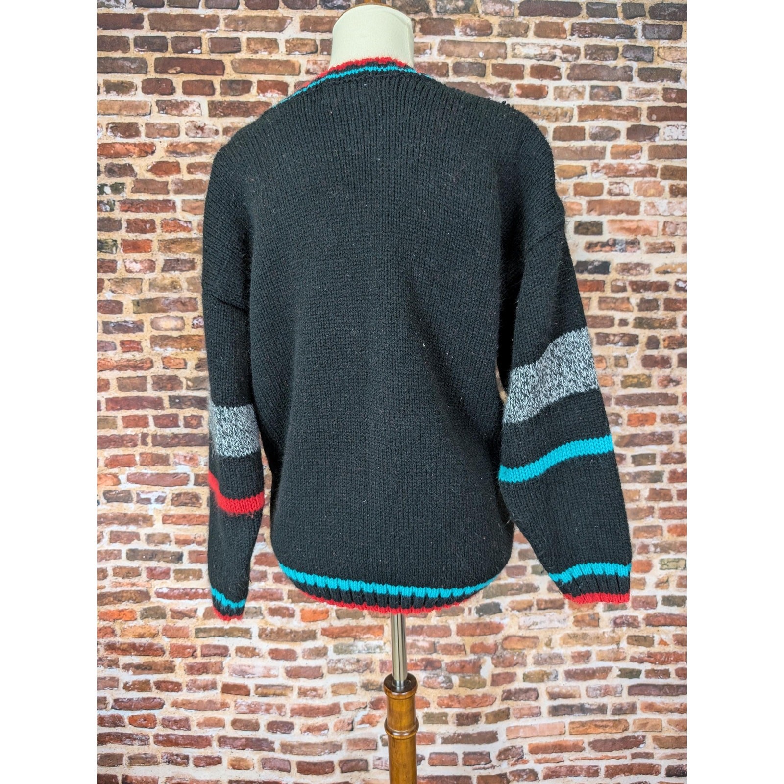 как выглядит Abstract Geometric 80s Sweater - Black and Colorful Knit Applique - Size Small фото