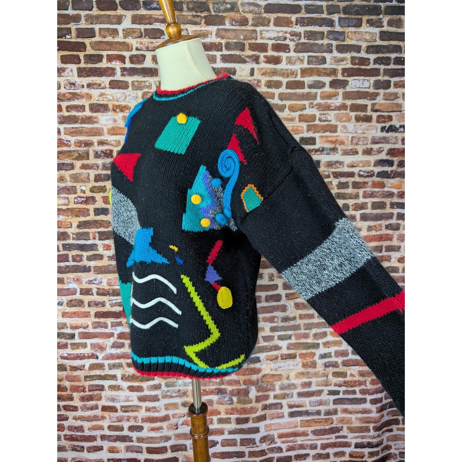 Abstract Geometric 80's Sweater - Black and Colorful Knit Applique - Size Small