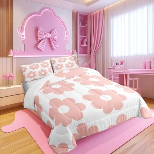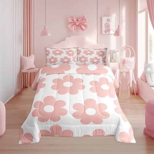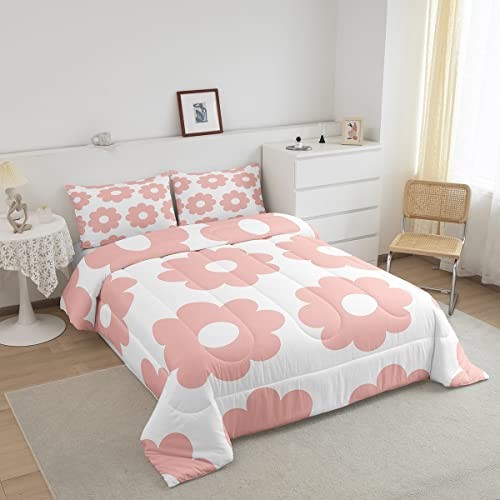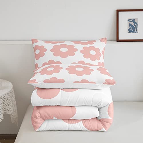 Girly Pink Size Down Comforter Set, 70s Groovy Daisy Flowers Twin Multi 03
