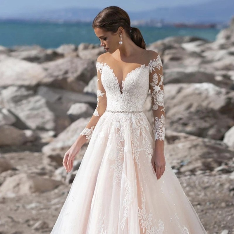 как выглядит A-Line Long Sleeve Wedding Dress Shiny Sweetheart with Crystal Belt Bride Gown фото