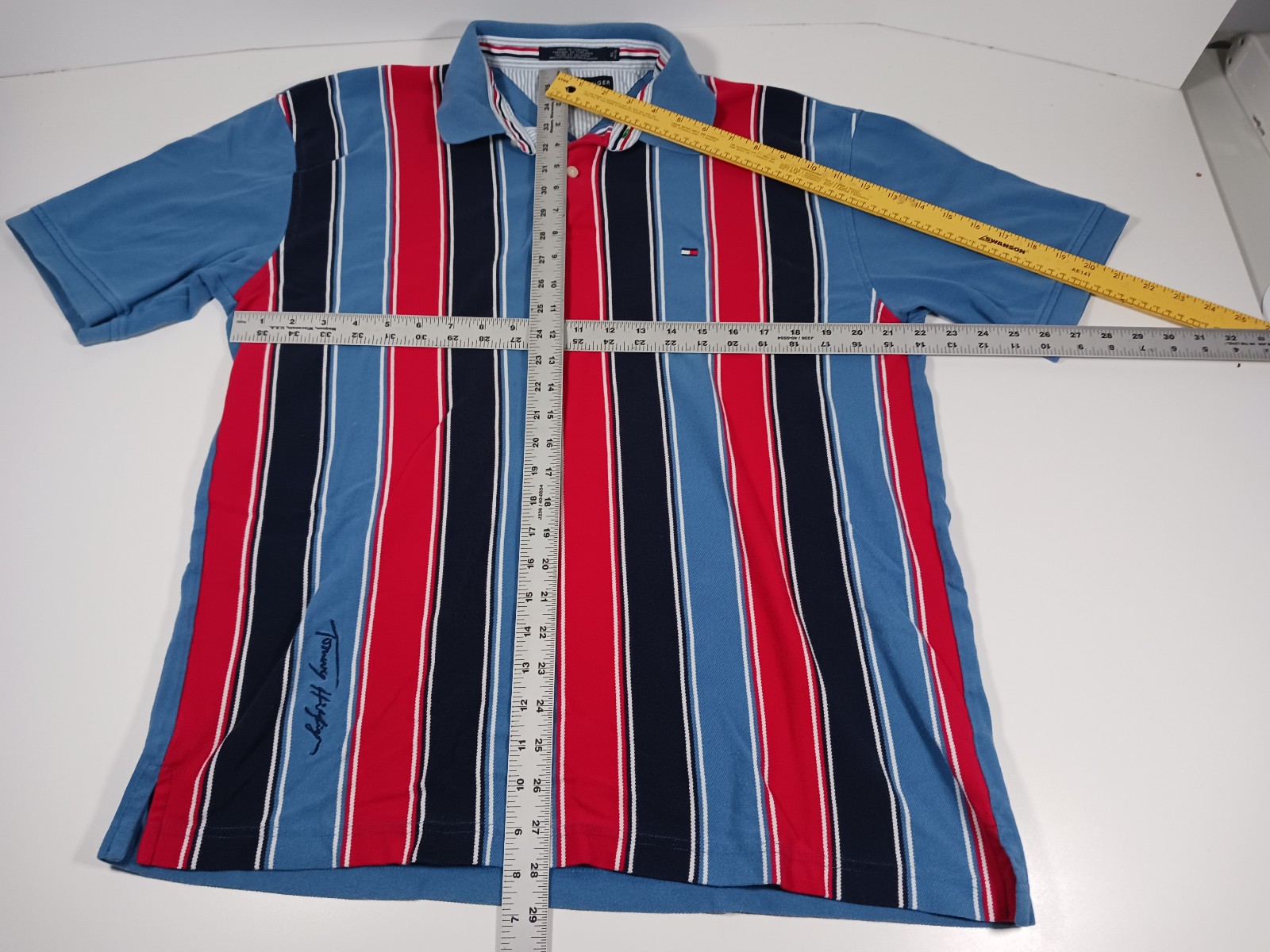 как выглядит Vintage Y2K Tommy Hilfiger Polo Shirt Mens XL Light Blue Navy Red White Striped фото