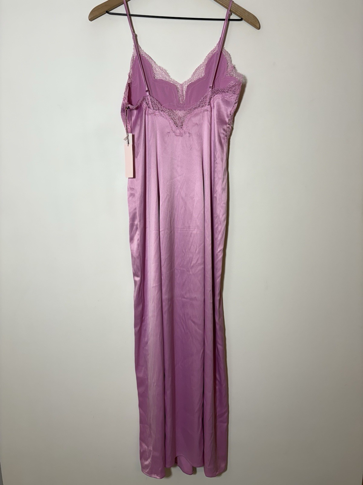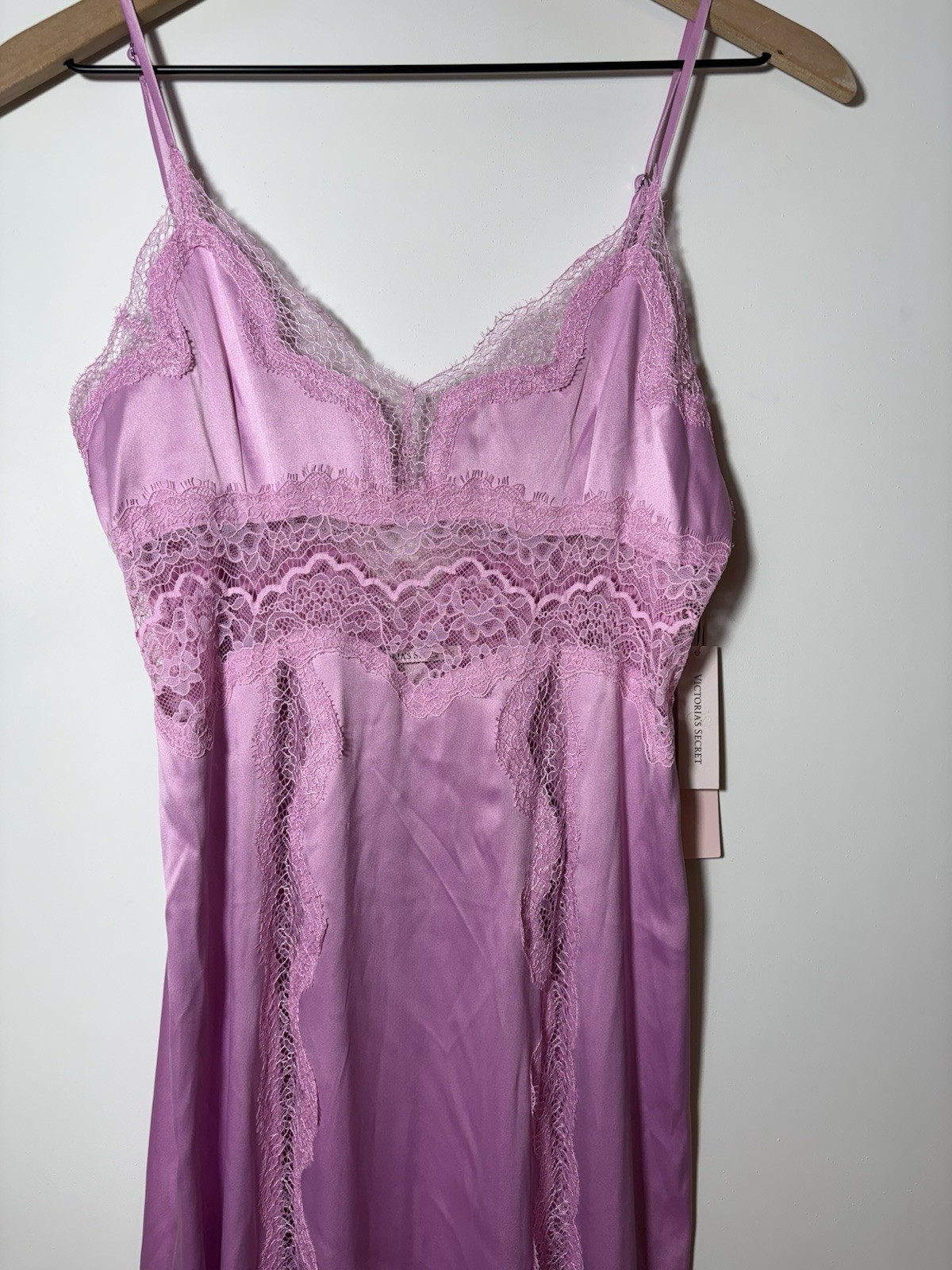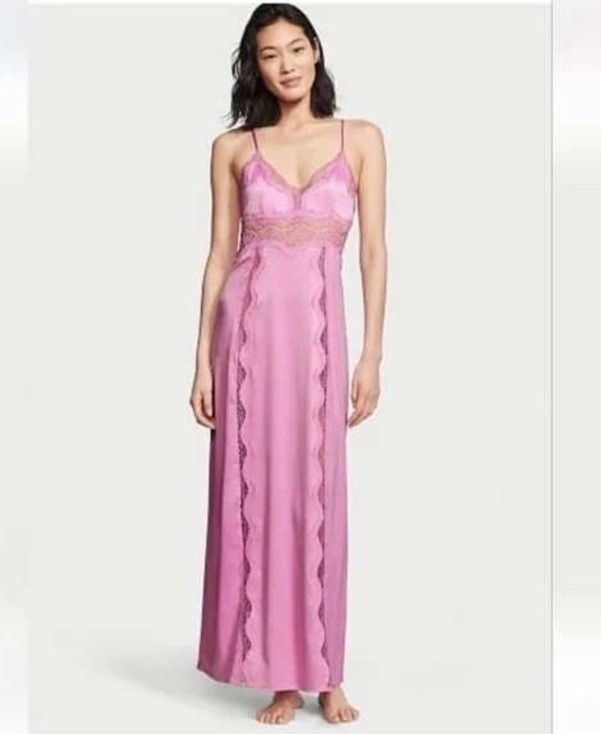 как выглядит NWT Victorias Secret Pink Satin LaceTrim Slip Dress Lingerie Maxi Nightgown XS фото