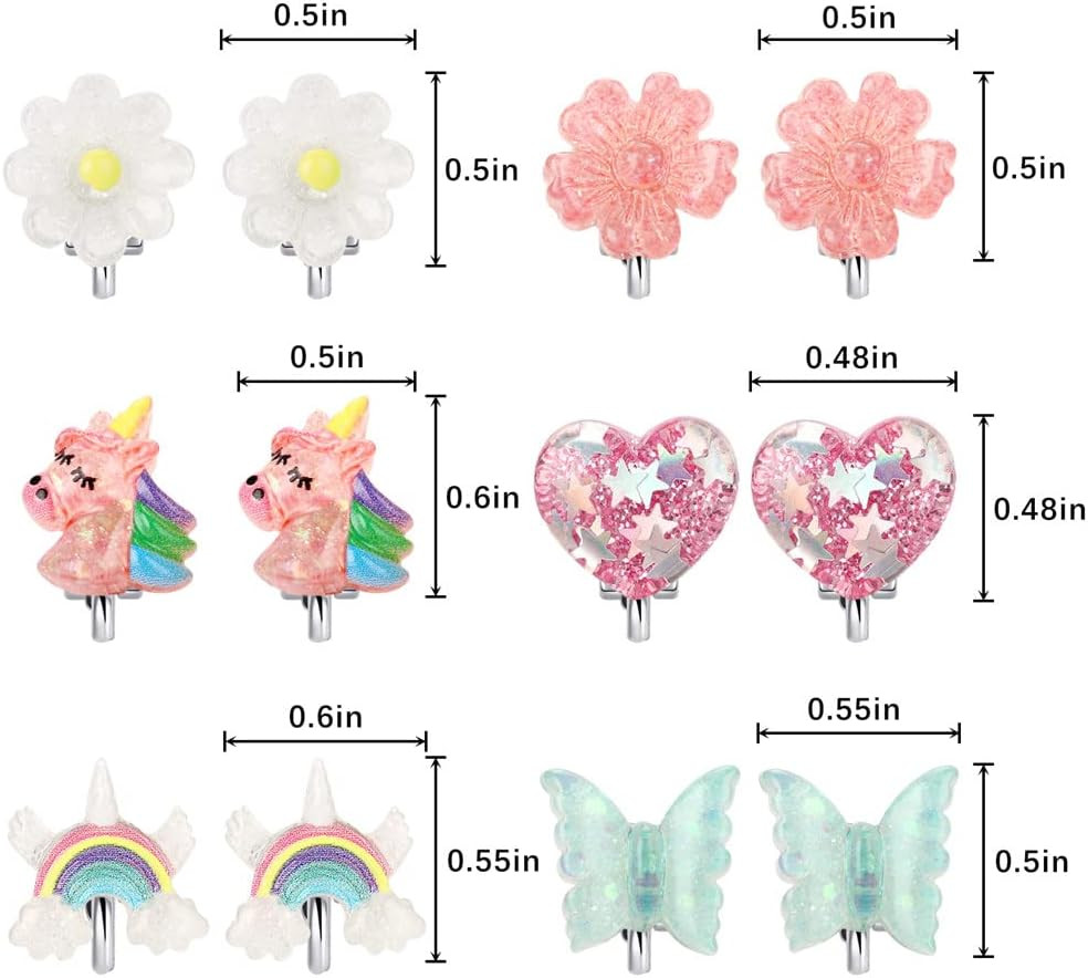 6Pairs Crystal Unicorn Clip on Earrings for Little Girls, Rainbow Clip-On Jewelr