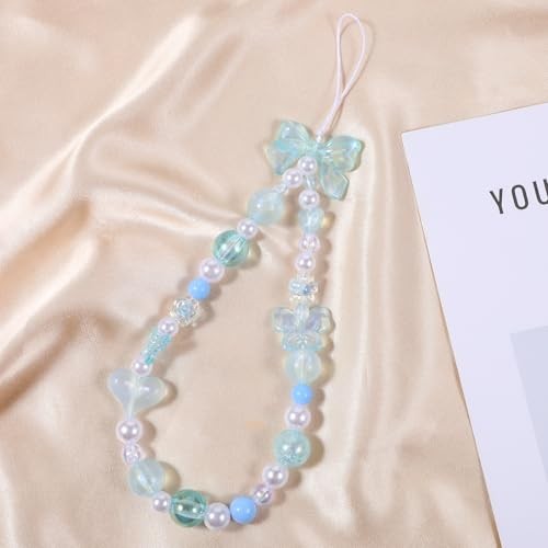 Beaded Phone Charms Strap, Blue Butterfly Flower Love Heart Bow Lanyard Chain