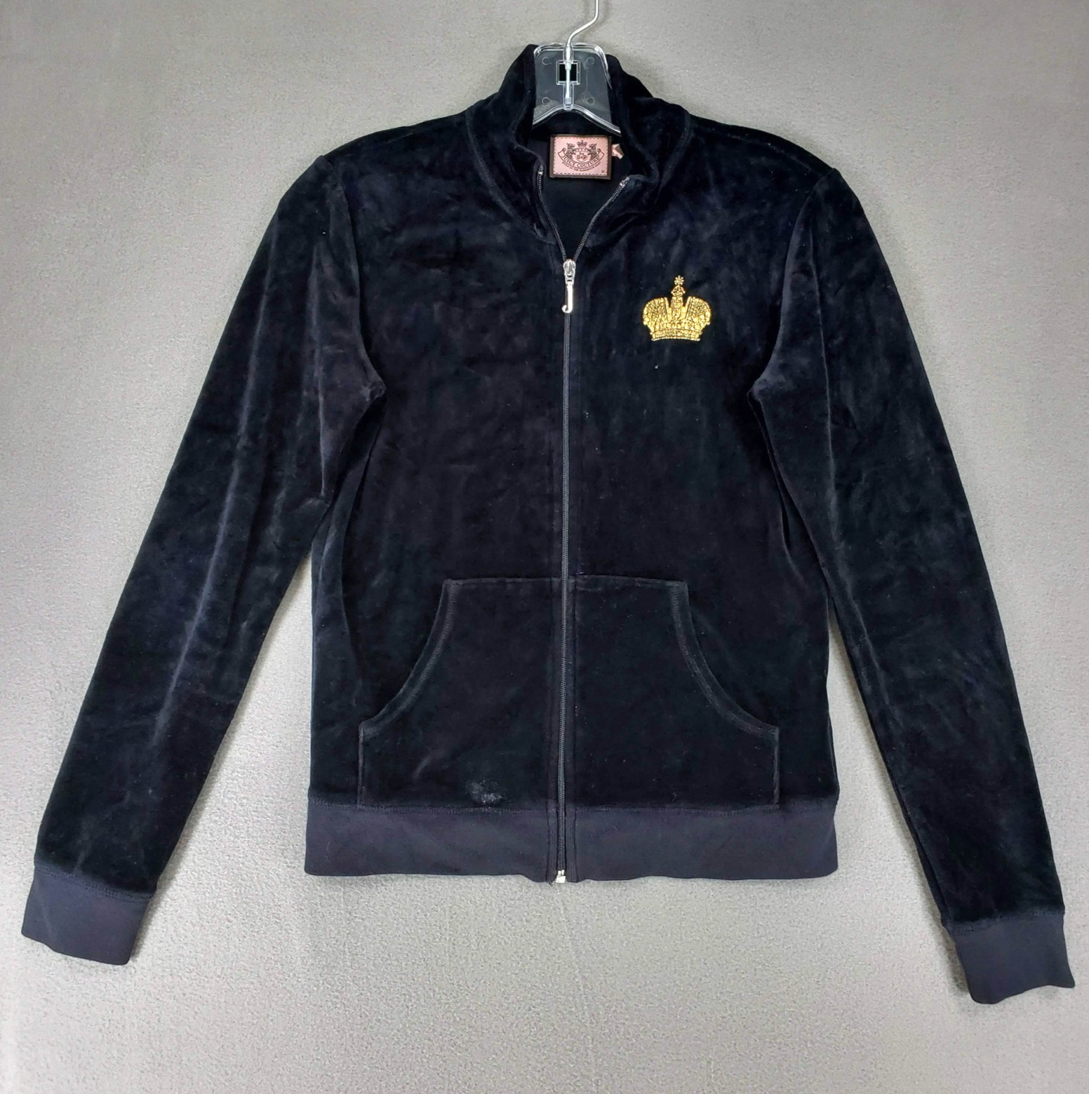 Vintage Y2K Juicy Couture Size M Black Velour Zip Track Jacket Big Logo Full Zip