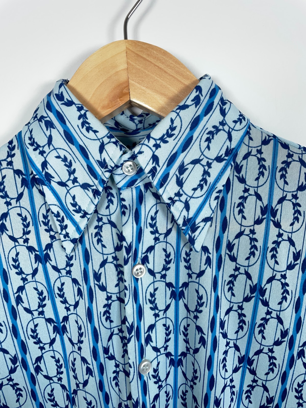 70s Geometric Pattern Shirt Men's 15.5 / Medium Blue Stretchy Polyester Disco
