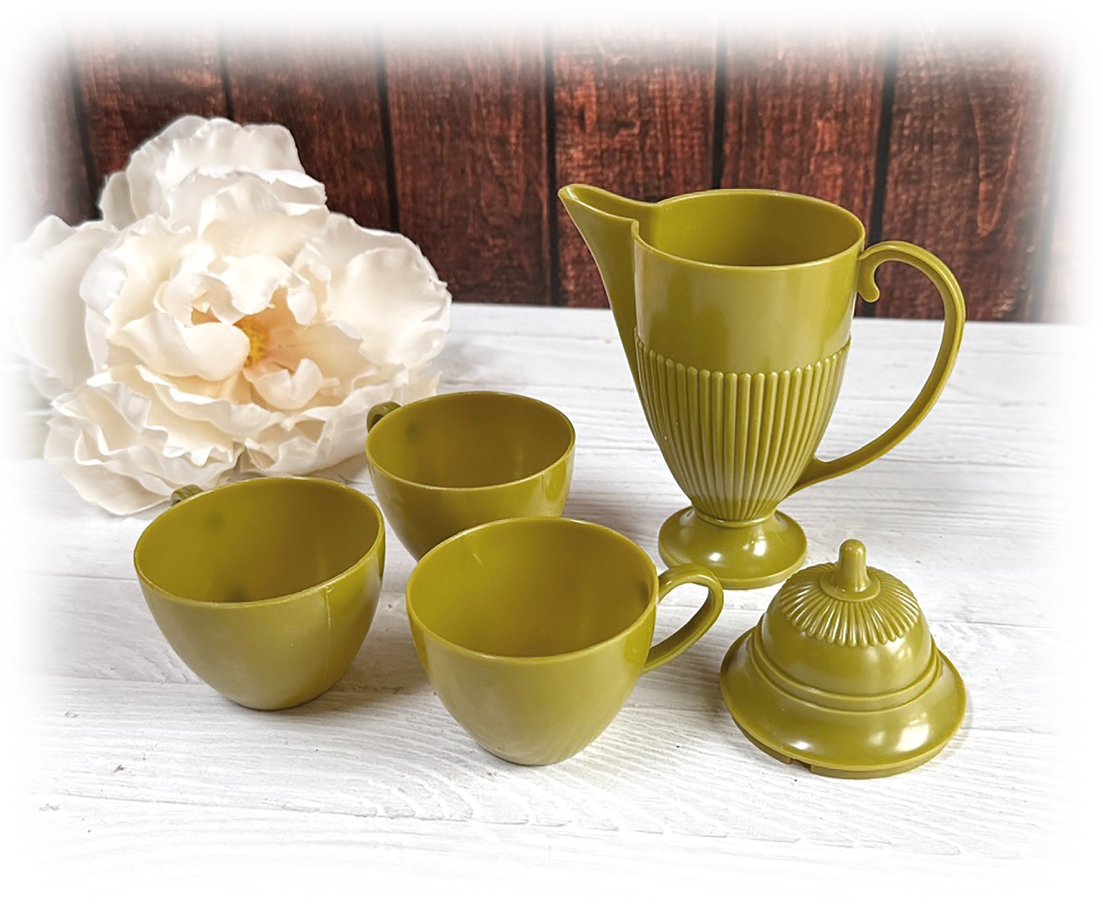 как выглядит VTG 1960-70s Olive Green Coffee Pot and Cups Childrens Play Kitchen Hong Kong фото