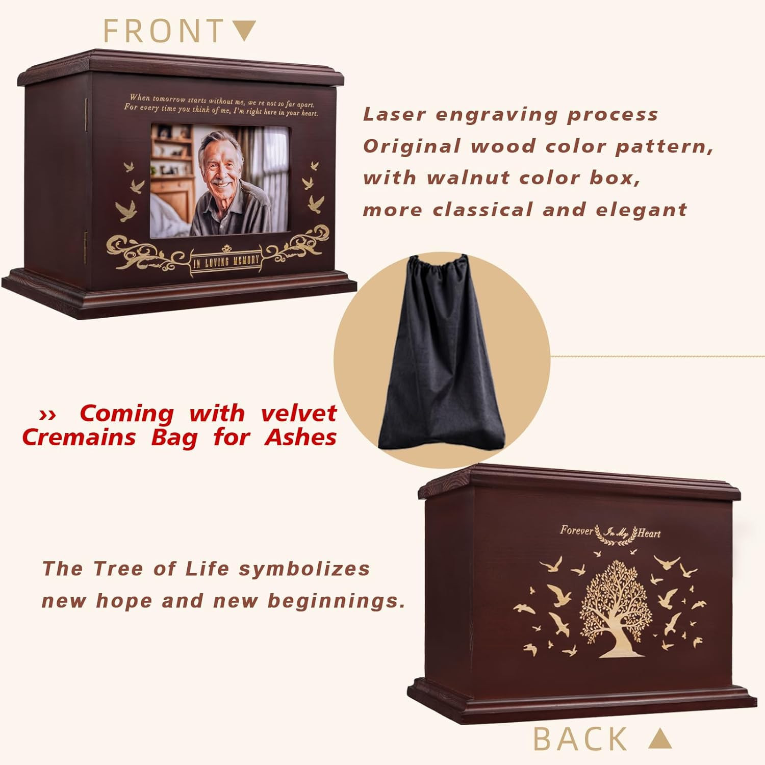 • Wooden Cremation Urn Box with Photo Frame Memorial Urn for Human Ashes Adult