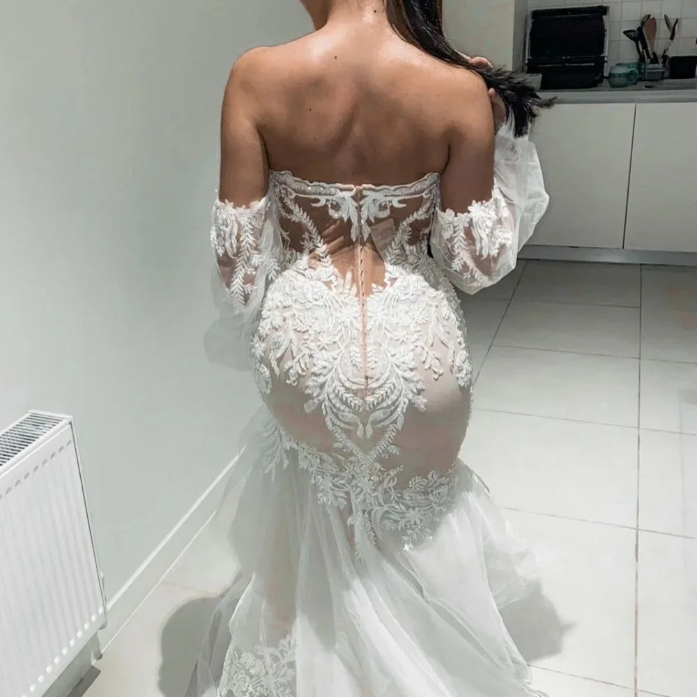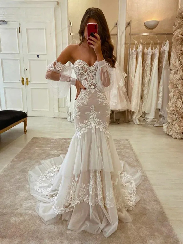 Princess Sweetheart Mermaid Wedding Dresses Appliques Tiered Lace Bridal Gowns