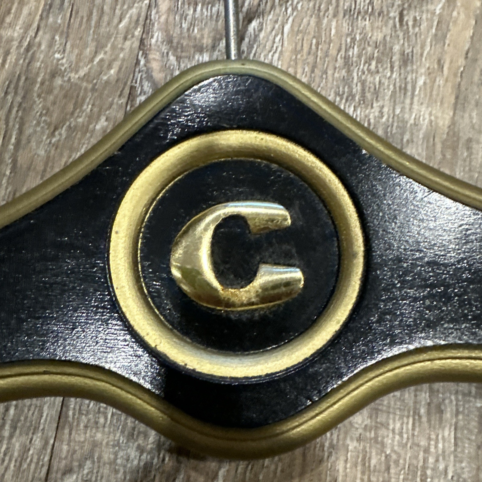 как выглядит Vintage Hollywood Regency MCM Wooden Clothes Hanger Gold black Letter C фото