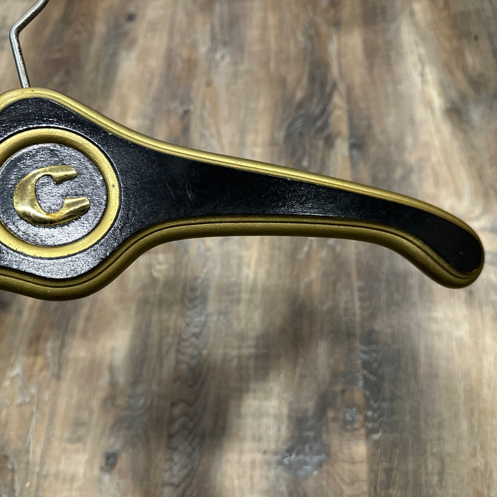 Vintage Hollywood Regency MCM Wooden Clothes Hanger Gold black Letter C