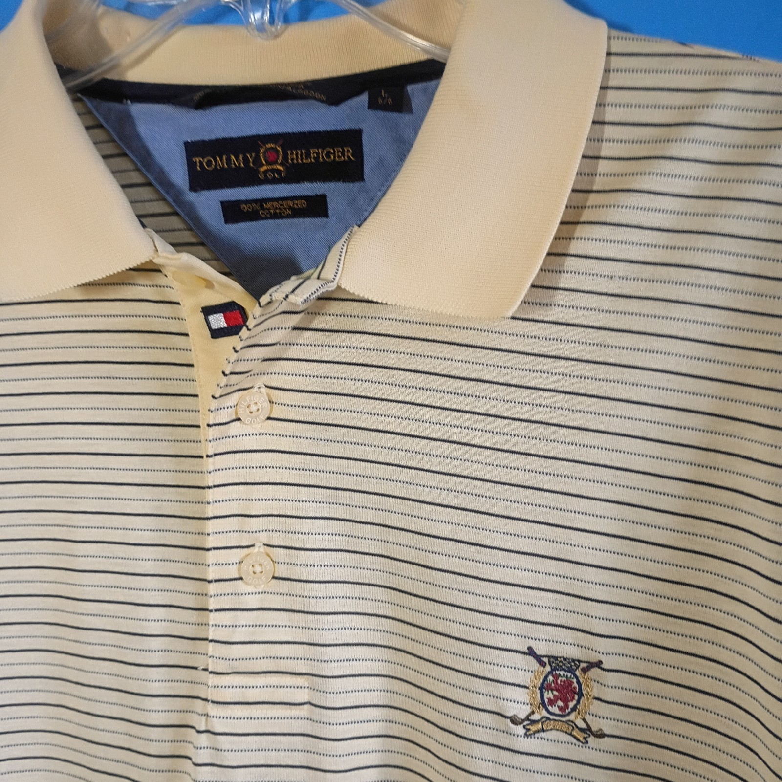 как выглядит Tommy Hilfiger Golf Polo Shirt Men s L 100 Mercerized Cotton Yellow Striped фото