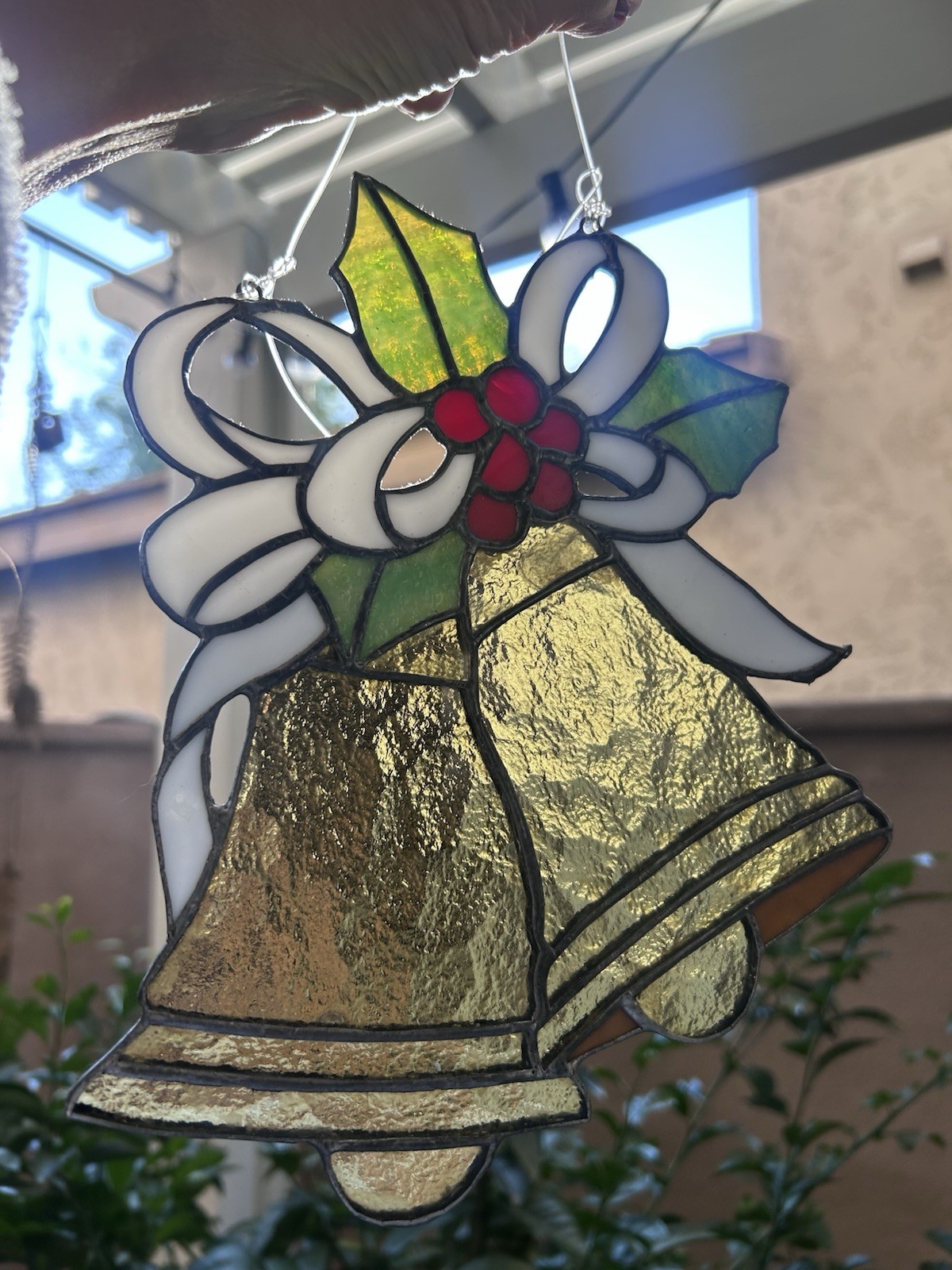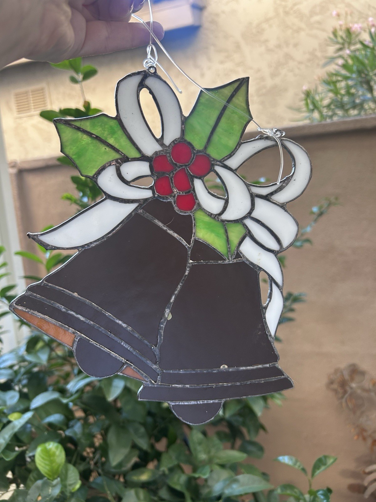 • Vintage stained glass and metallic Christmas bells 8 x 9.5