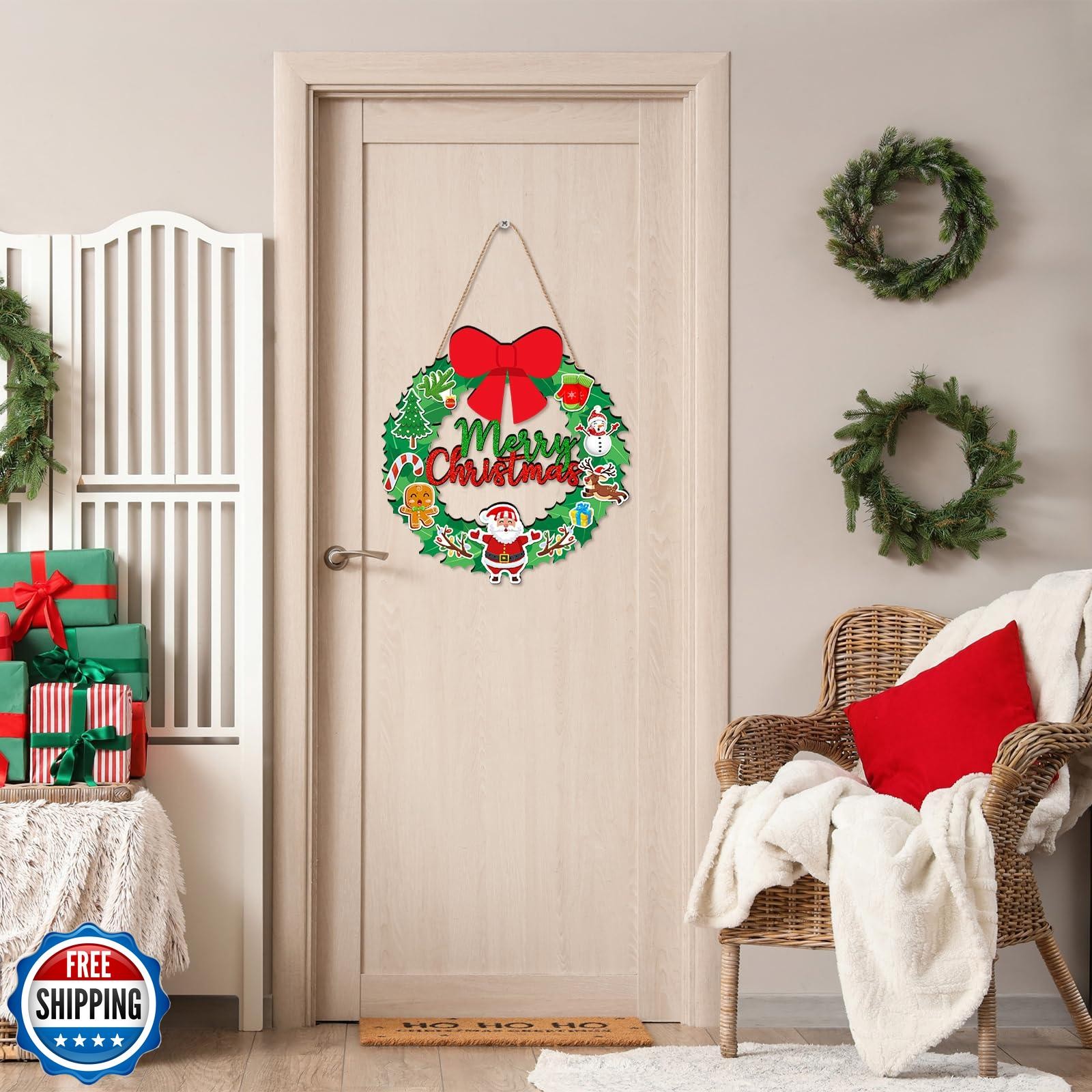 Merry Christmas Wreath Hanging Sign For Front Door, Wooden Welcom