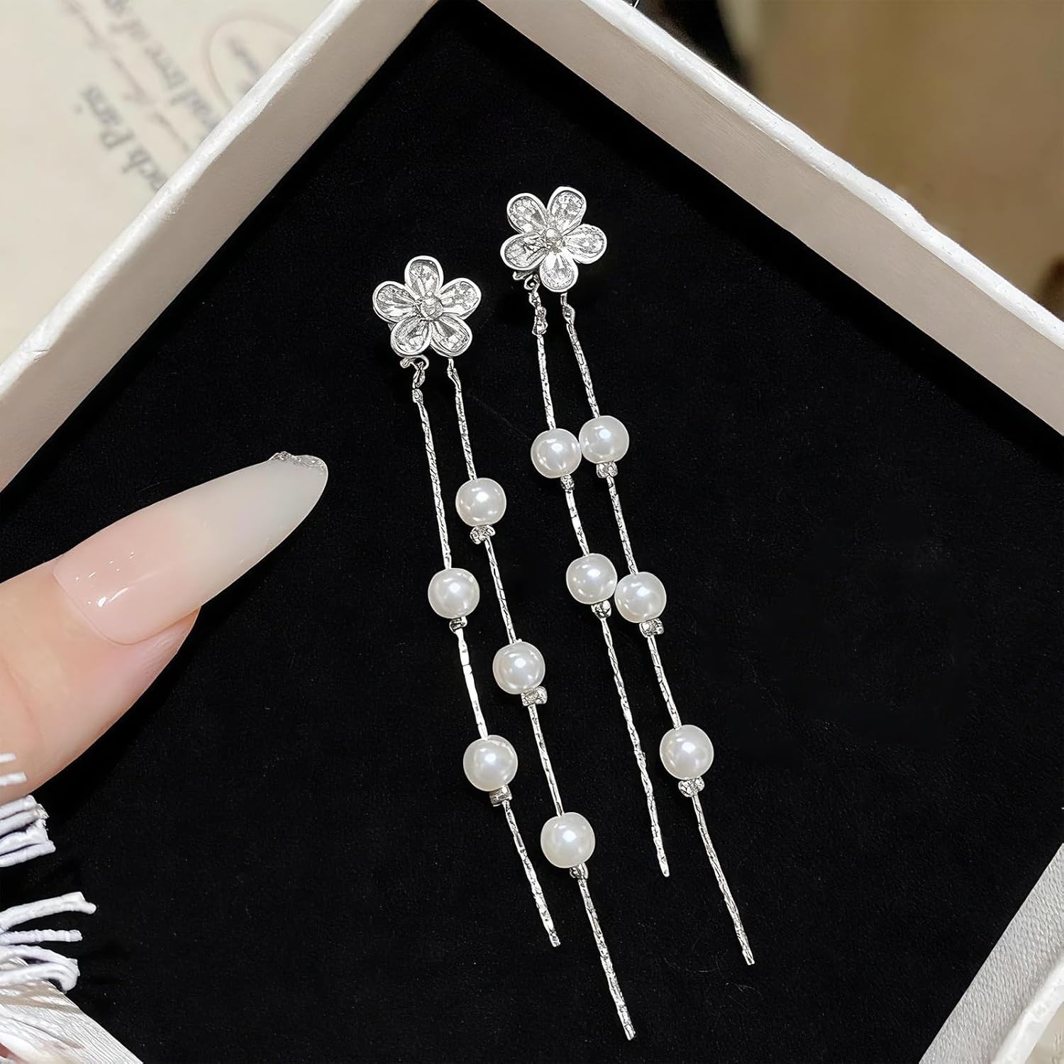 Long Pearl Dangle Earrings for Women Gold Flower Tassel Earring Silver