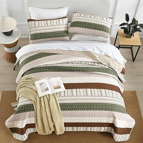 Striped Quilt Set Size, Boho Striped Bedspread Coverlet Set Queen Brown Green