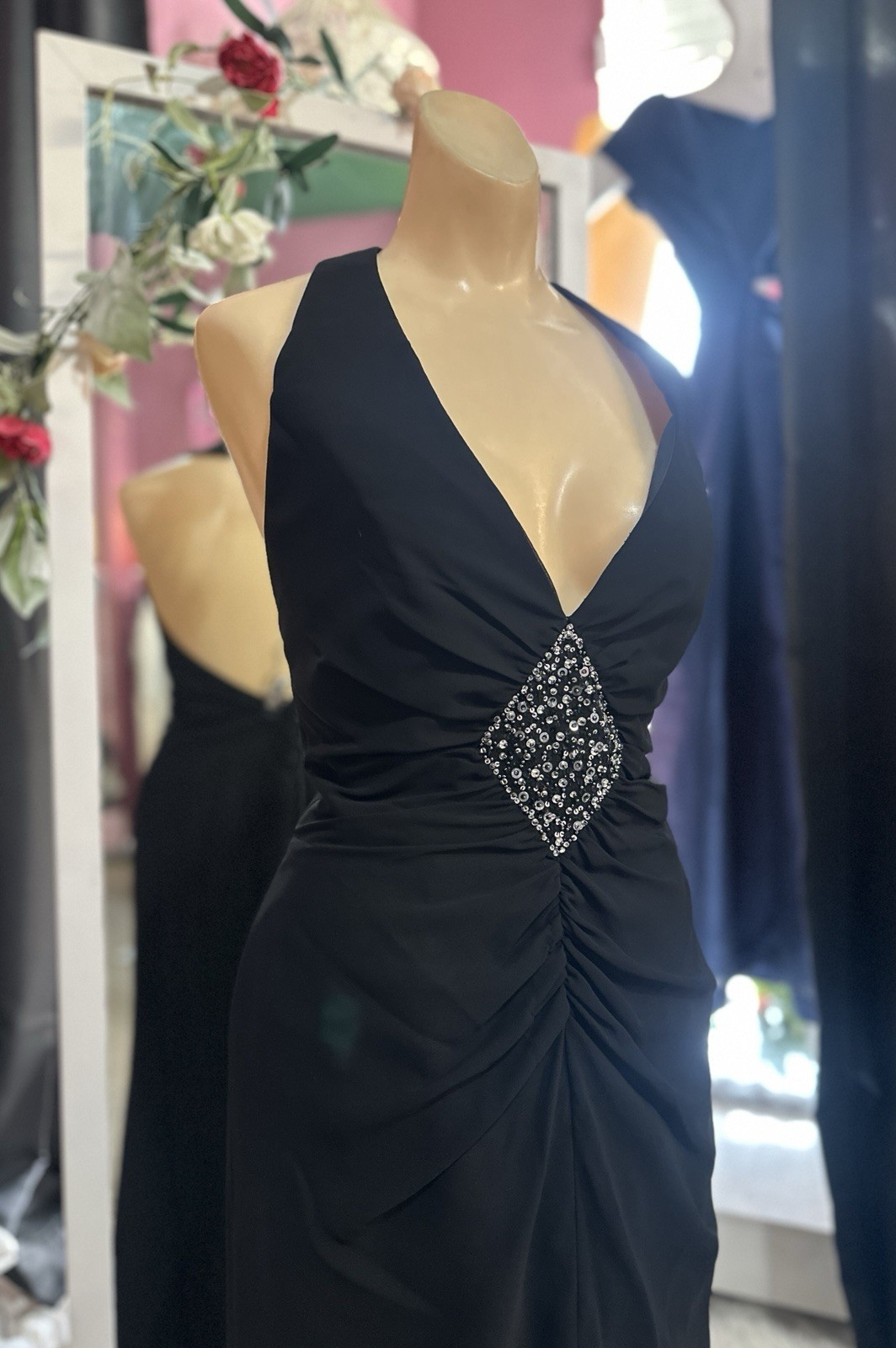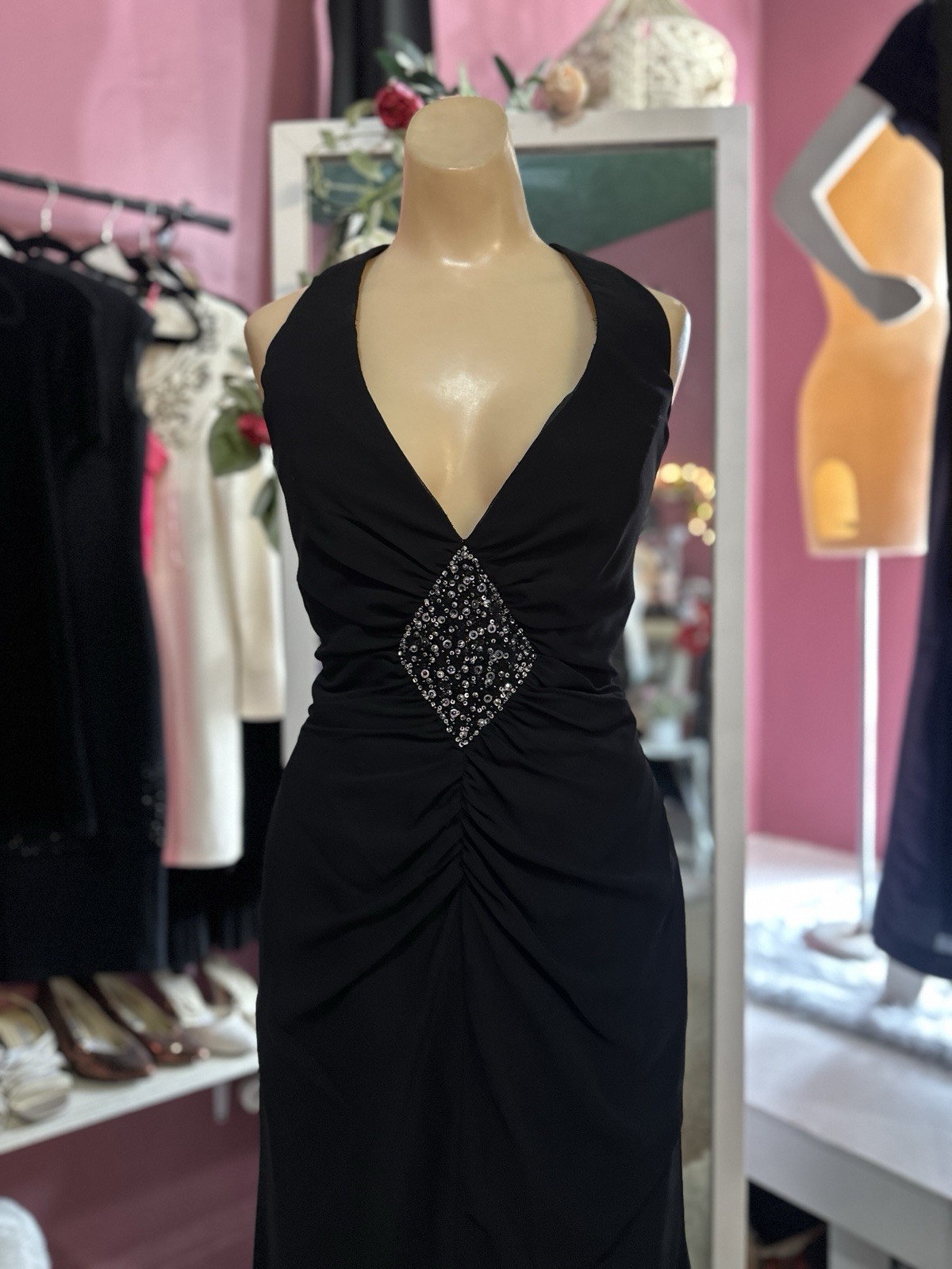 Black Maxi Formal Evening Prom Dress Beaded Halter Y2K Style Open Back M