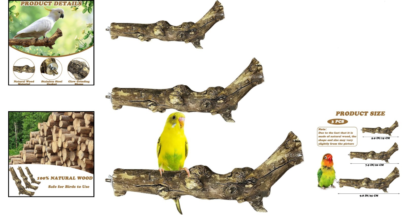 3-Pack Natural Wood Bird Perches - Safe Chewing and Climbing Essentials