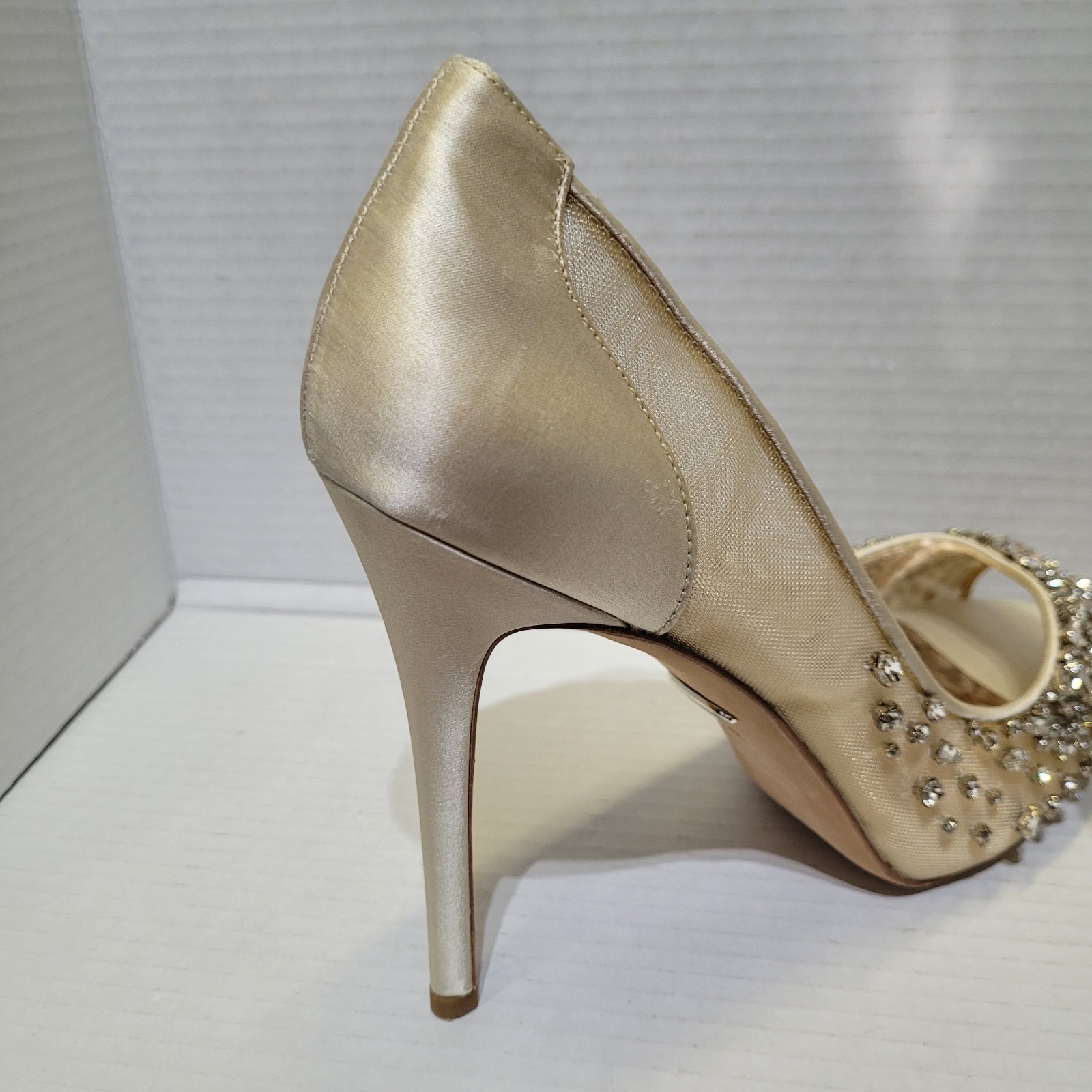 как выглядит Size 9.5 - BADGLEY MISCHKA Beige Satin Rhinestone Stiletto - 4.5in Heel фото