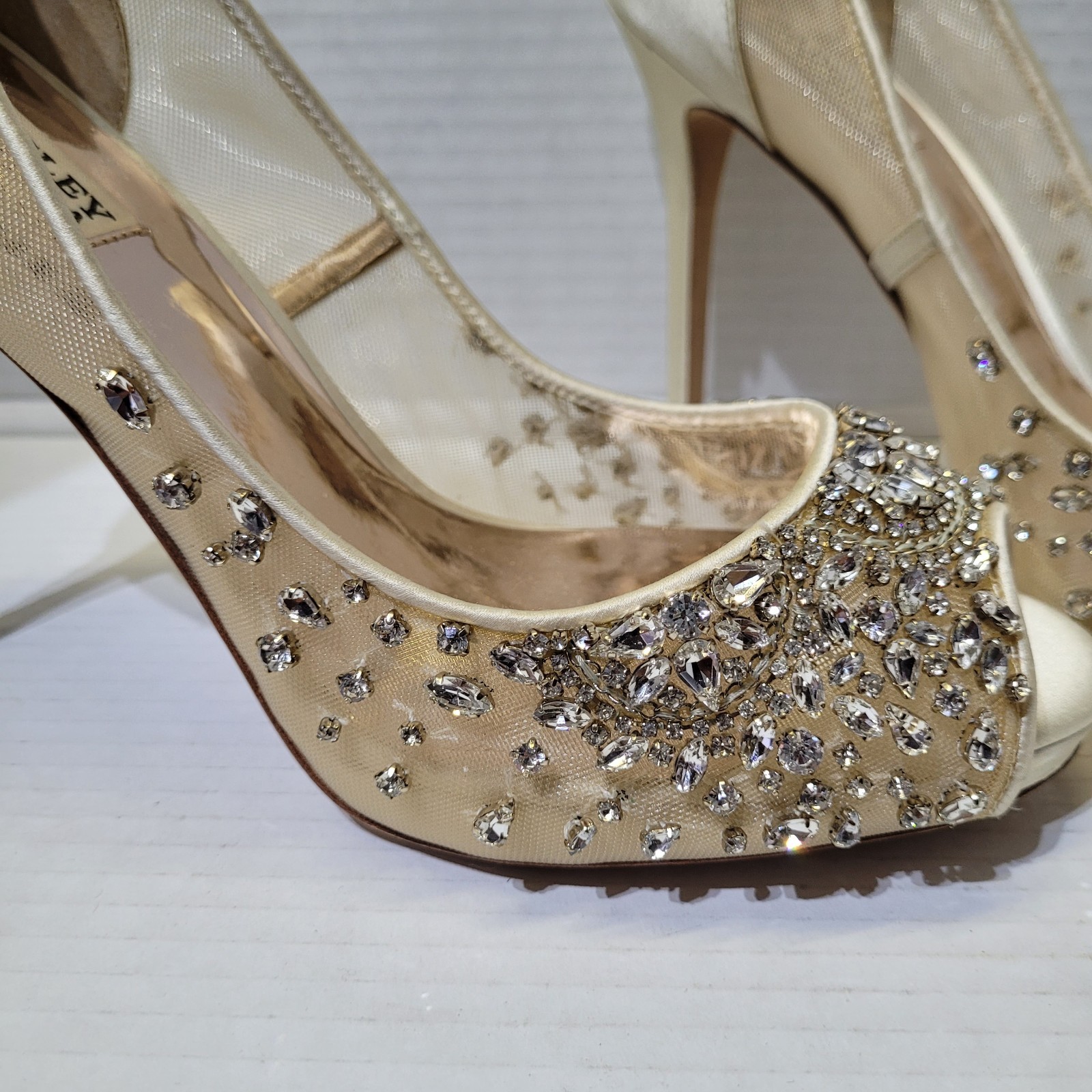 Size 9.5 - BADGLEY MISCHKA Beige Satin Rhinestone Stiletto - 4.5in Heel