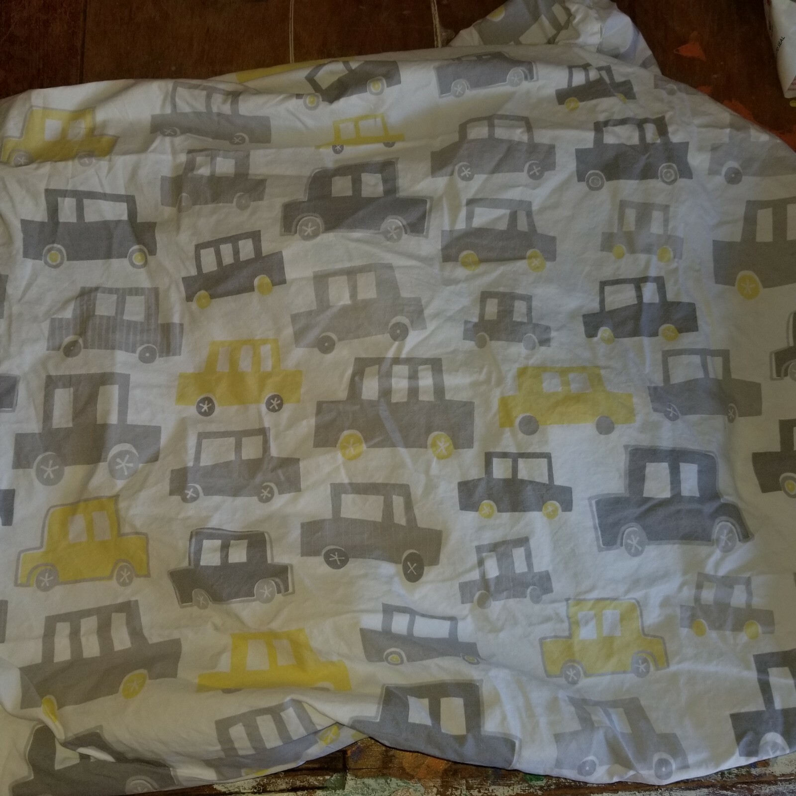 как выглядит Pottery Barn Kids "Gray/Yellow Cars" Crib Fitted Sheet фото