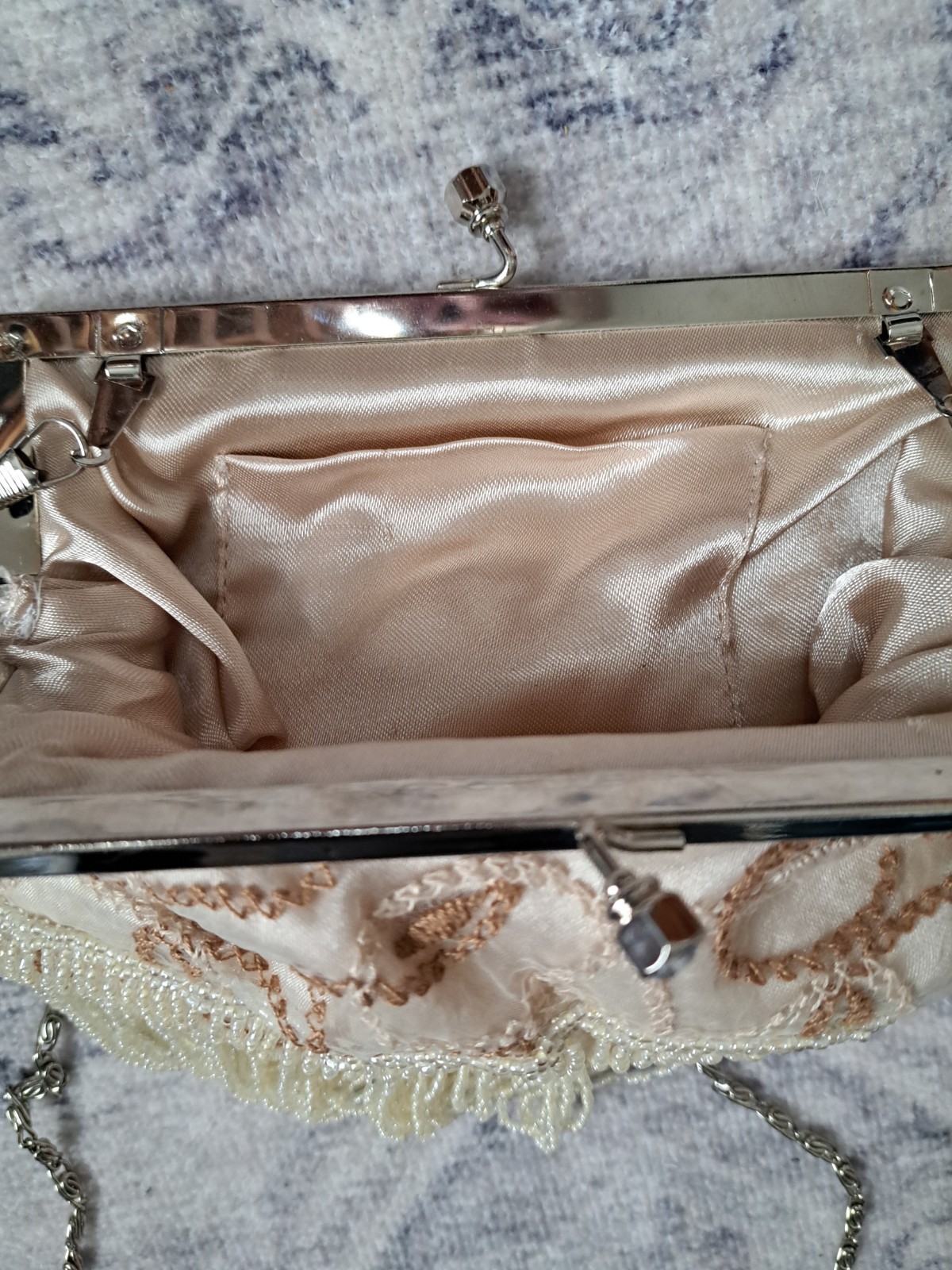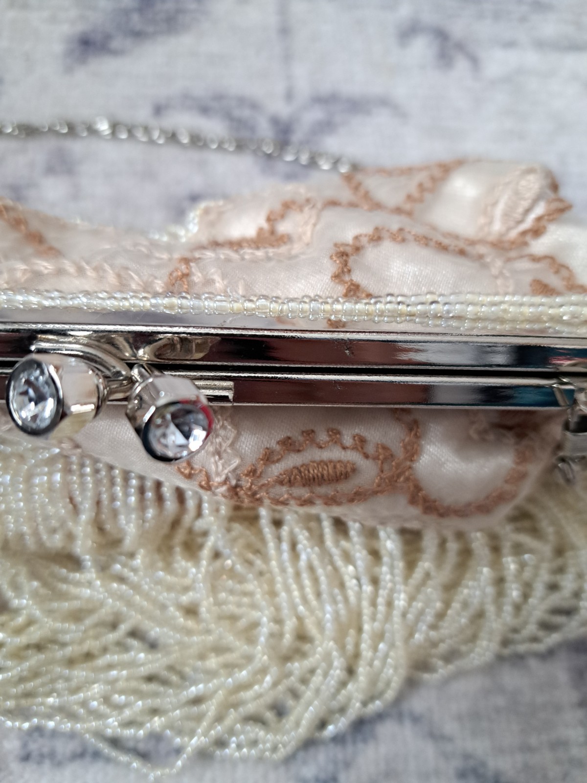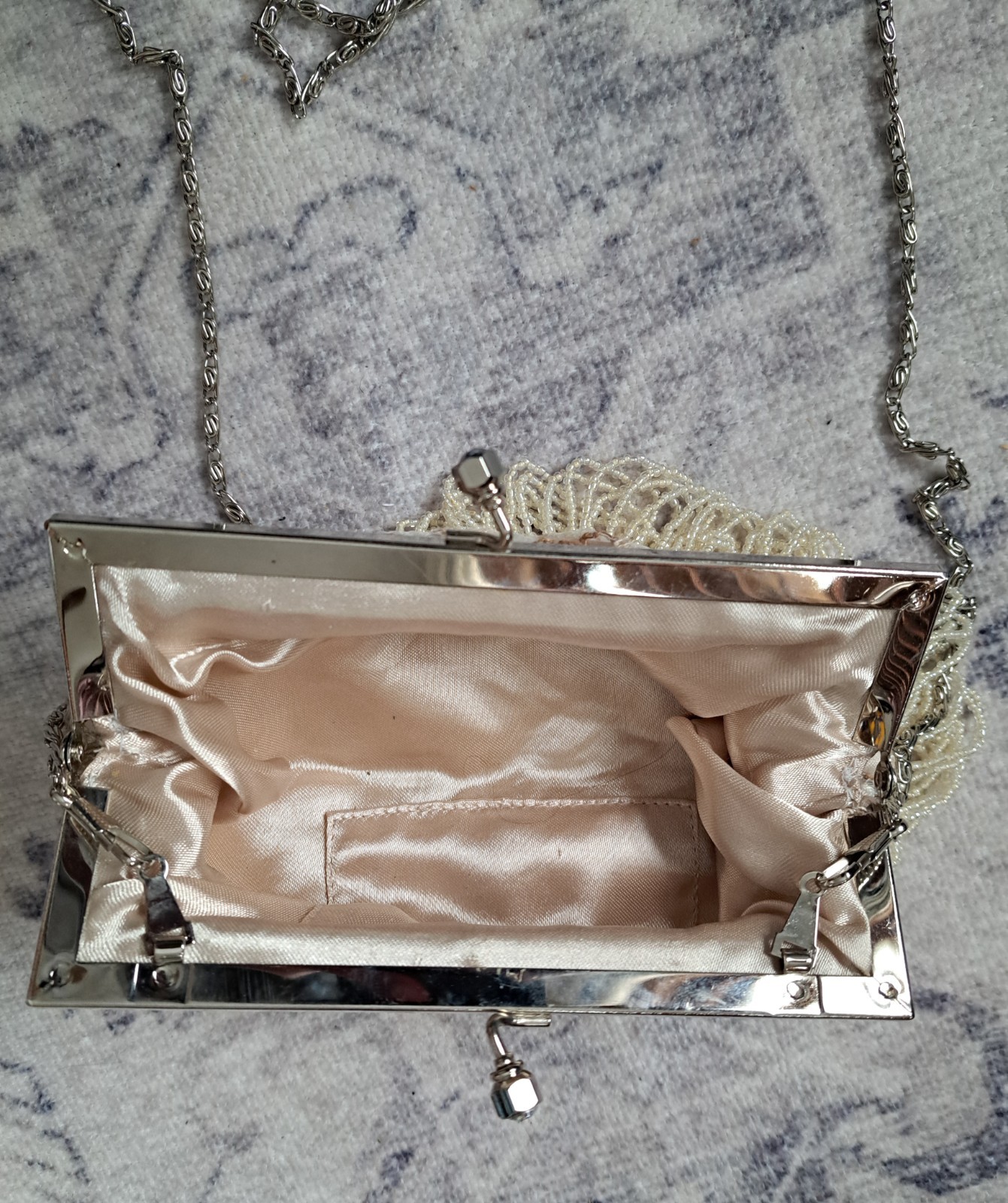 как выглядит Vintage Style Ivory Beaded Evening Clutch Bag With Snap Closure And Chain Strap. фото