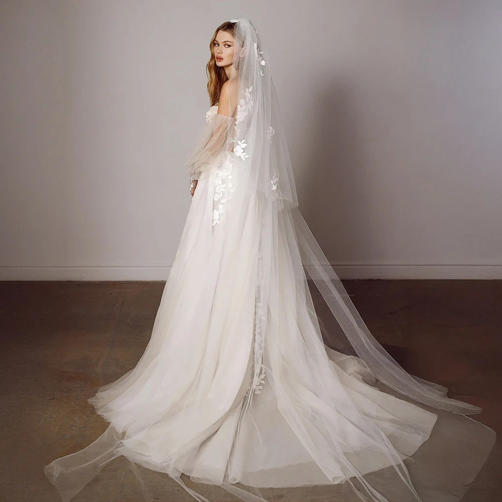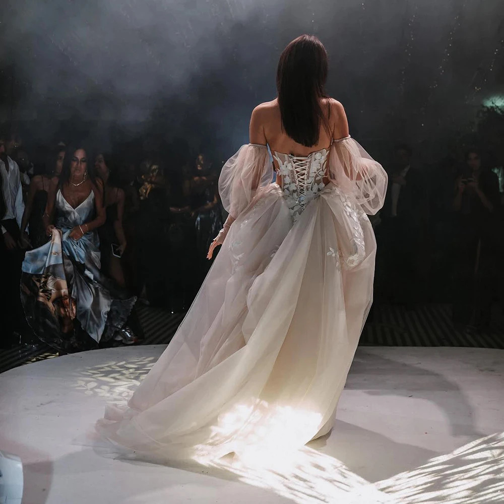 Off Shoulder Detachable Long Sleeves Sheer Wedding Dress Side Applique Lace Gown