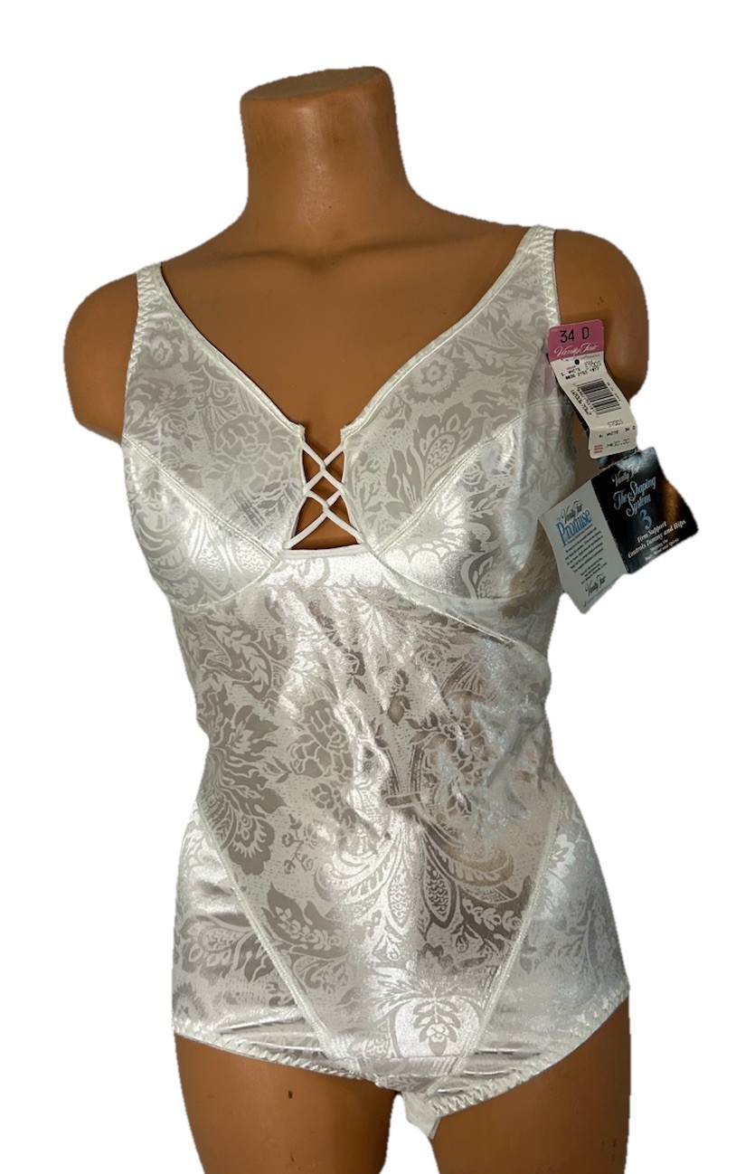Vtg 80s 90s VANITY FAIR White Satin Floral Jacquard Bodysuit Body Shaper 34D