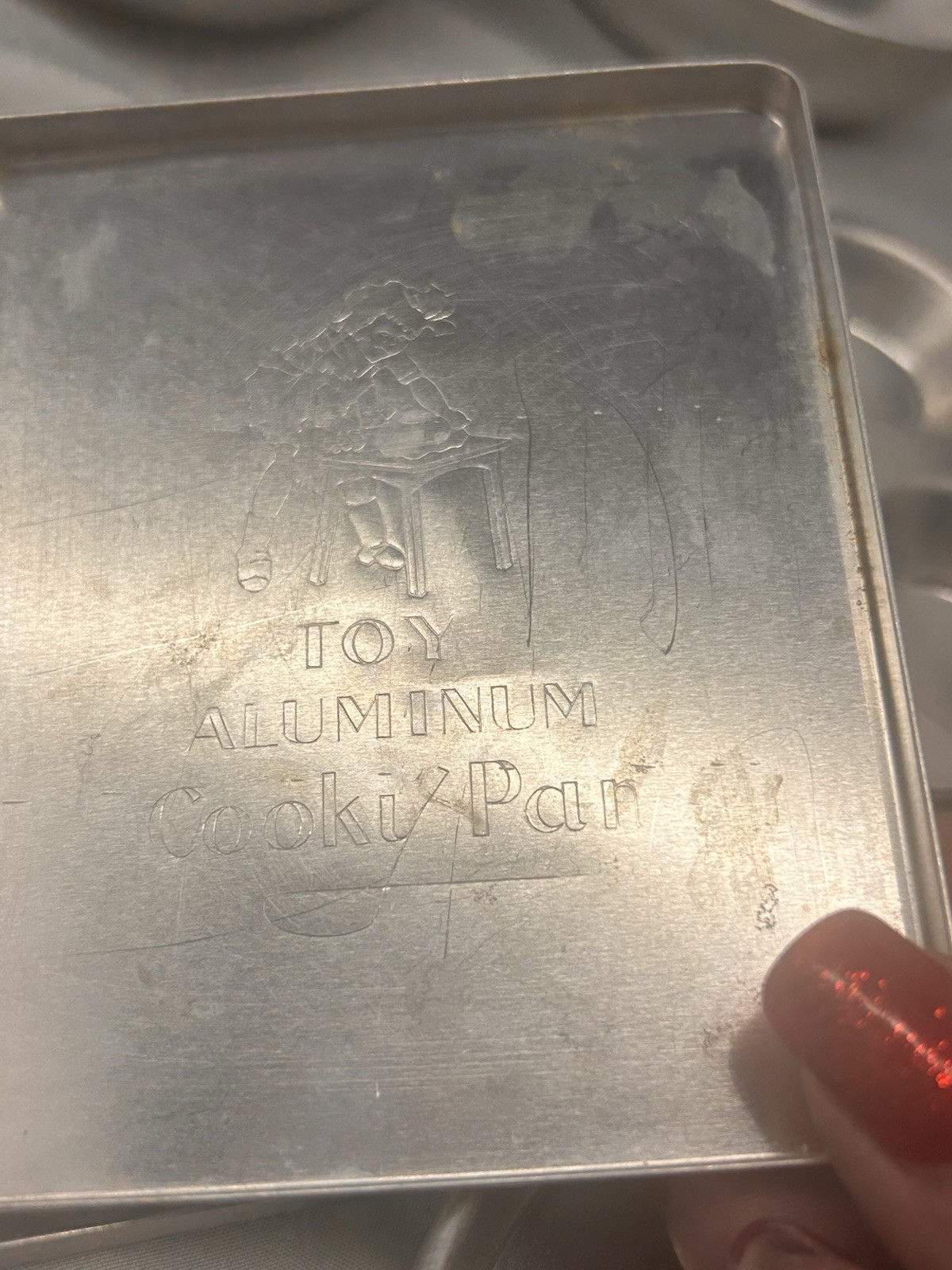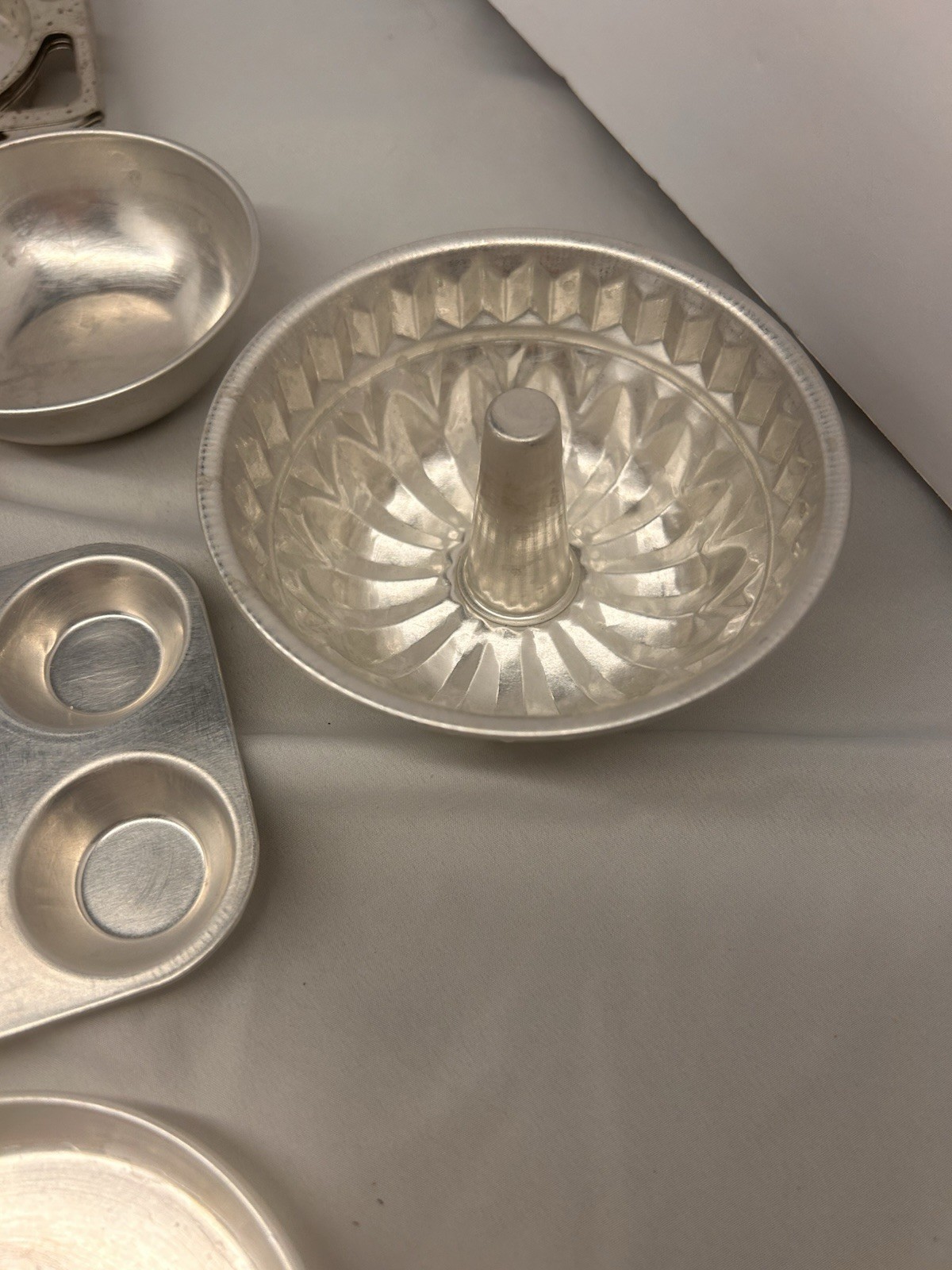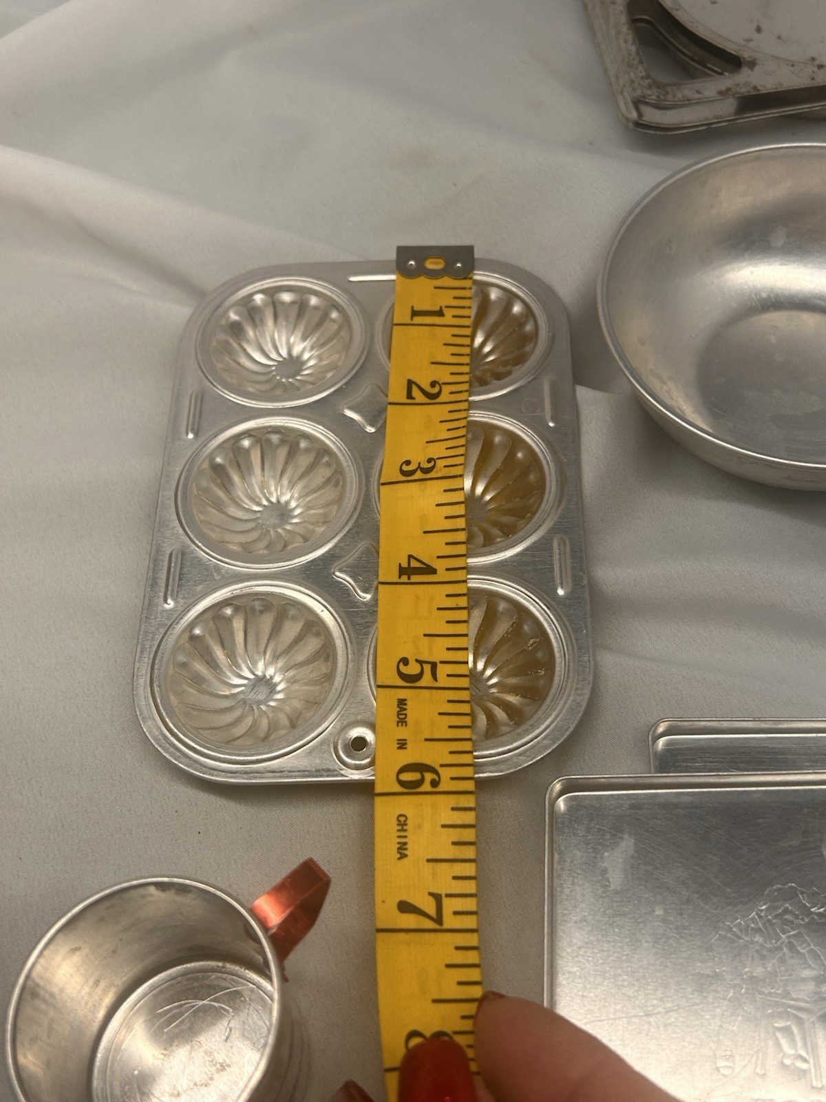 как выглядит Vintage Retro Aluminum 1950s Childs Baking Set Cookware Making Cupcake фото