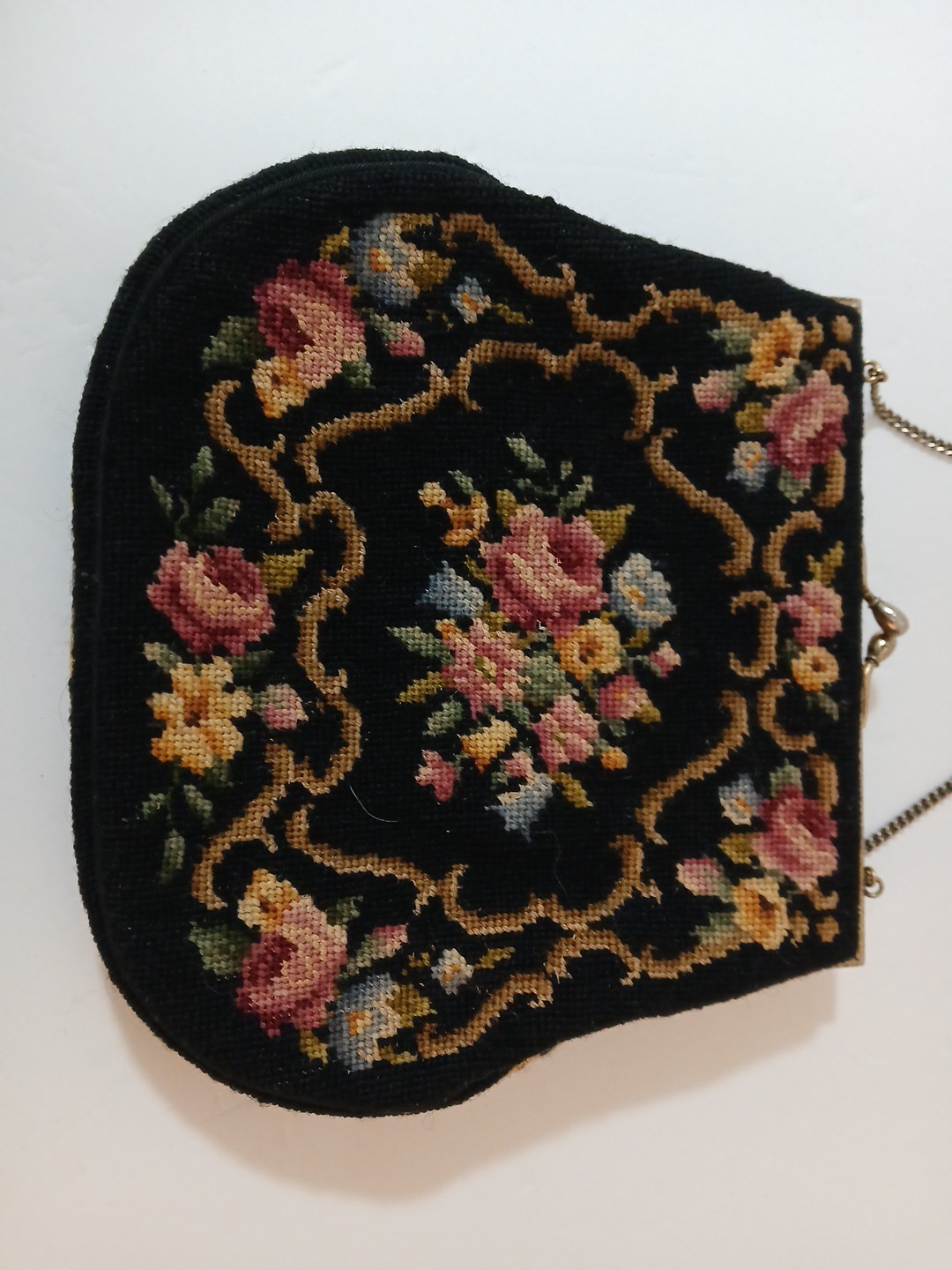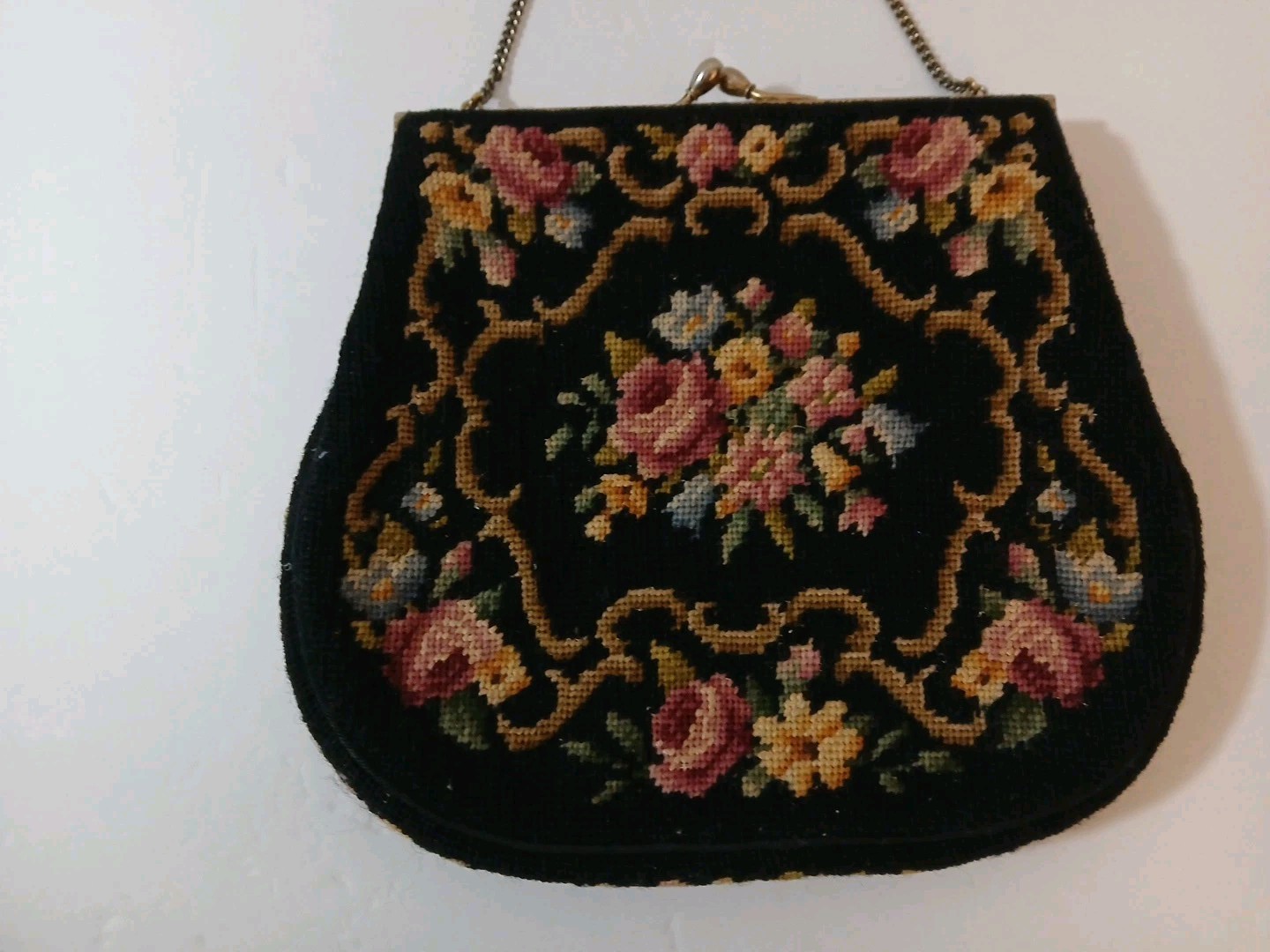 Vintage Needlepoint Tapestry Purse Handbag Black W Floral Kisslock Closure EUC