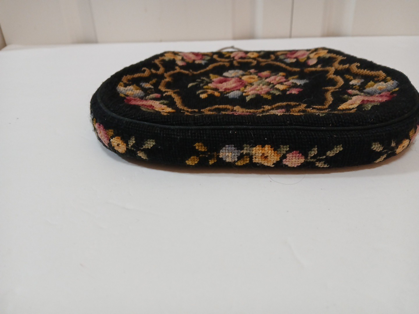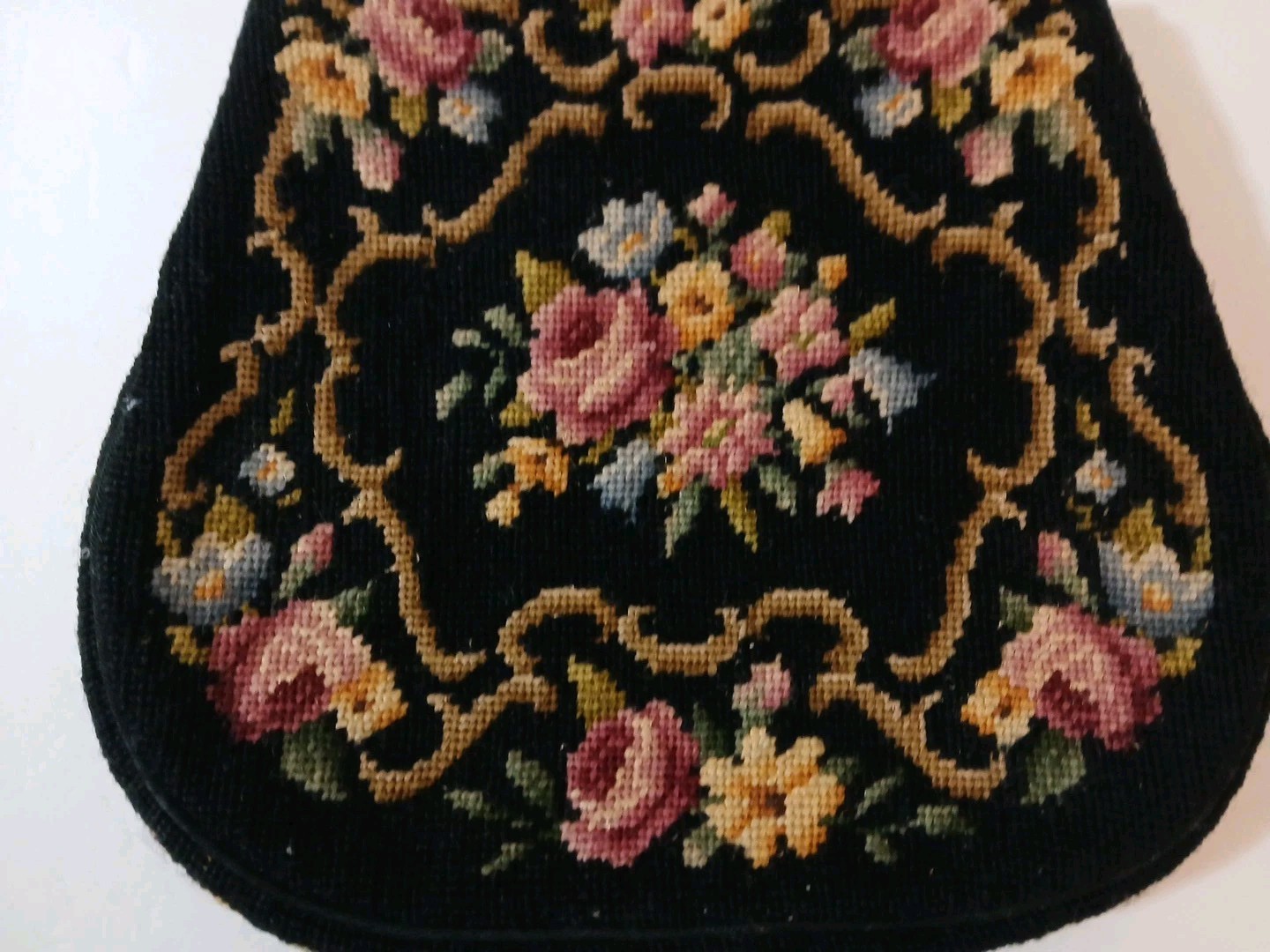 как выглядит Vintage Needlepoint Tapestry Purse Handbag Black W Floral Kisslock Closure EUC фото