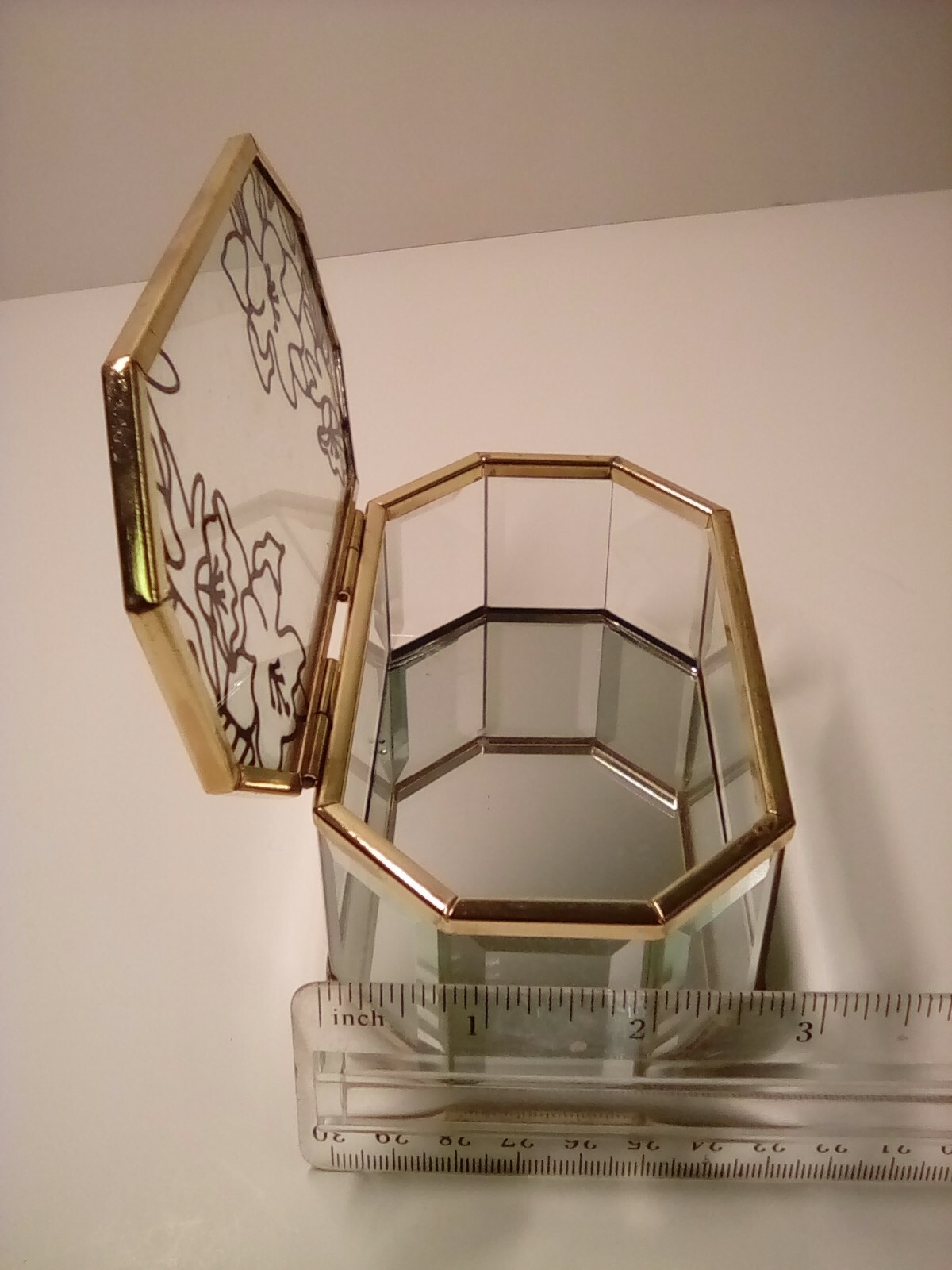 • Vin.8 sided glass Brass mirrored trinket box, hinged lid, black floral design