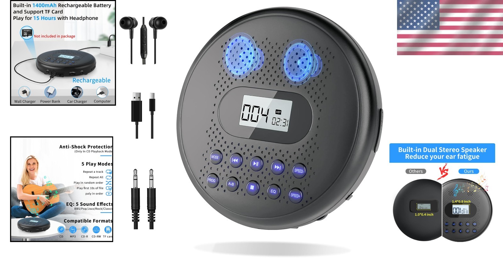 Особенности: Anti-Skip Protection, Rechargeable, Built-in Dual Stereo Speakers, Backlit Display, Last Memory, A-B Repeat, Portable, Lightweight