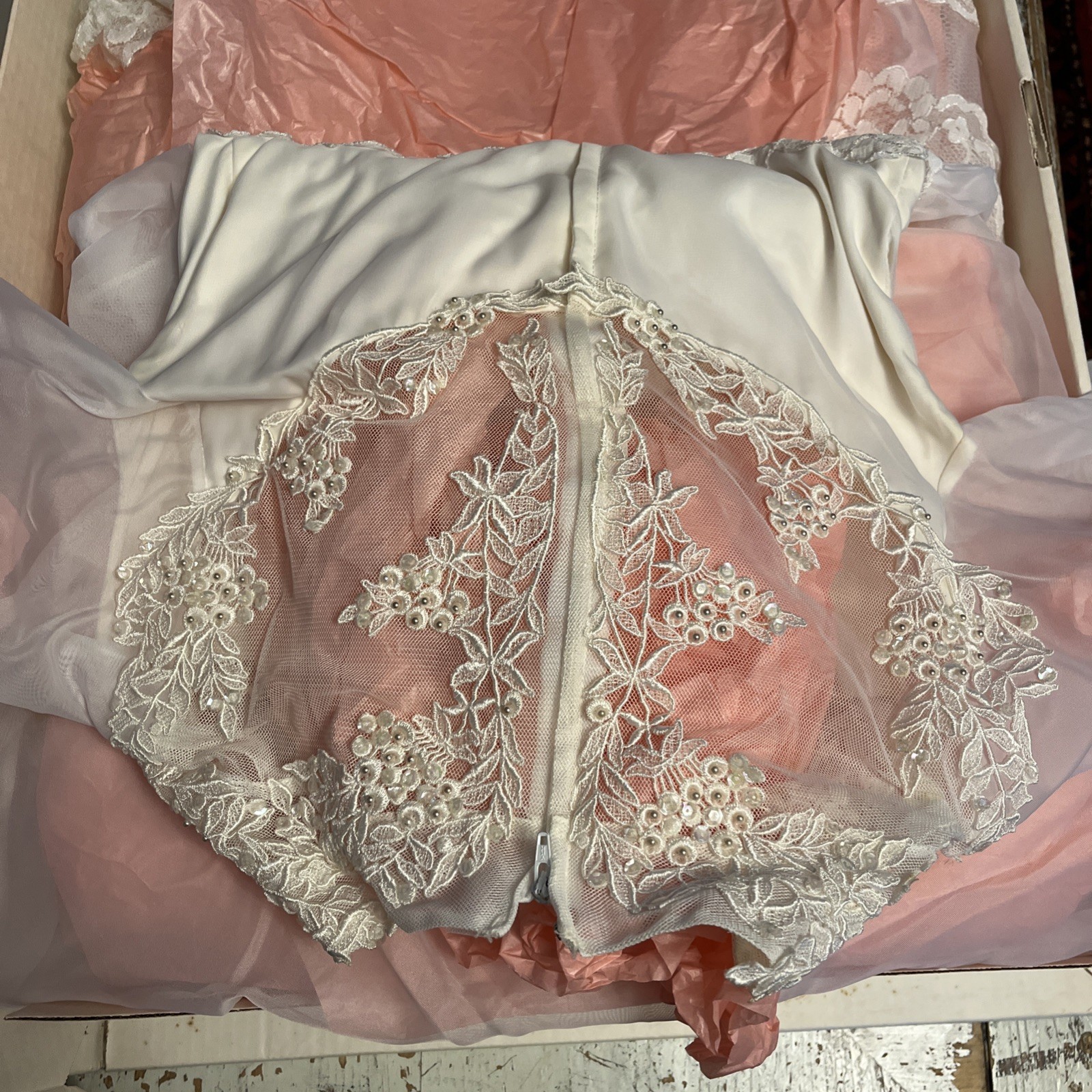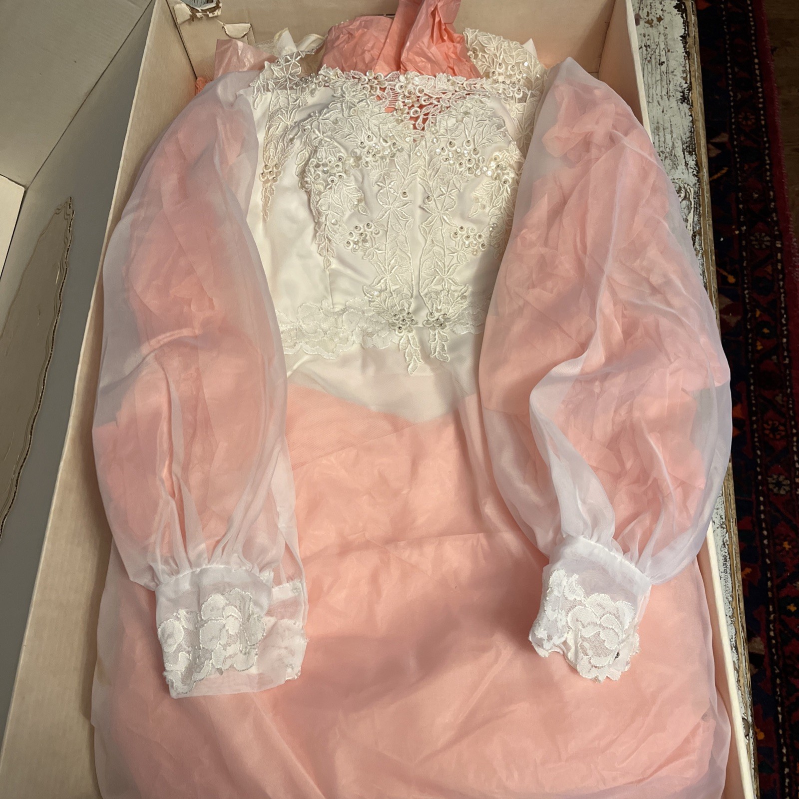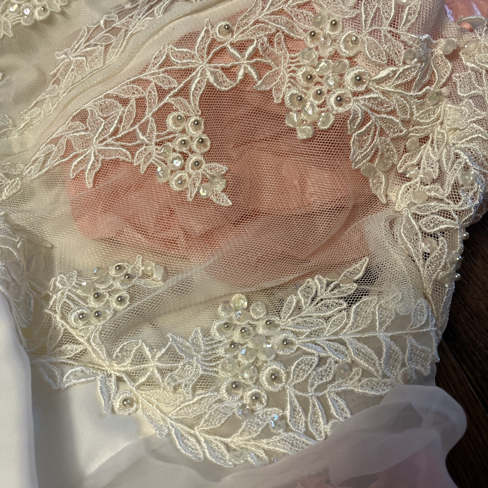 как выглядит Vintage 1950s Wedding Dress Lace train beaded puff long sleeve layered sheer фото