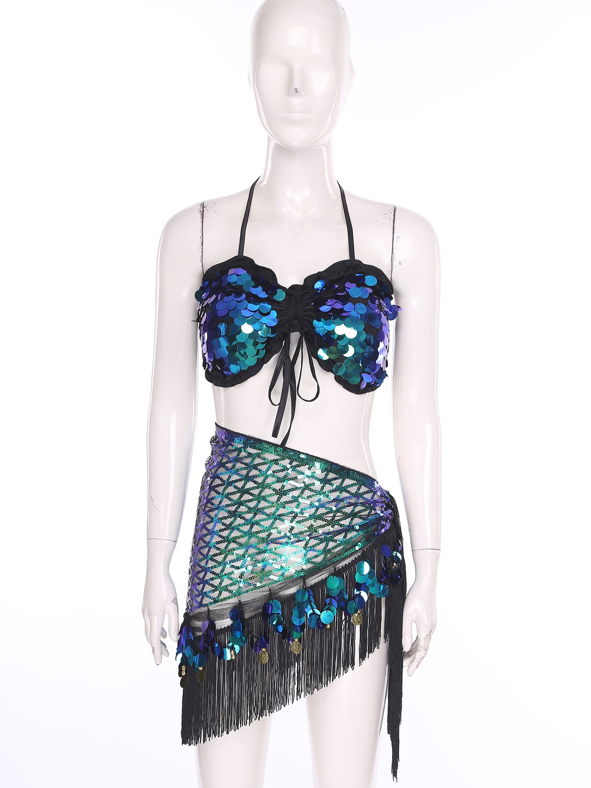 Womens Set Stage Outfits Tassel Dancewear Triangle Shiny Carnival Dance Chain