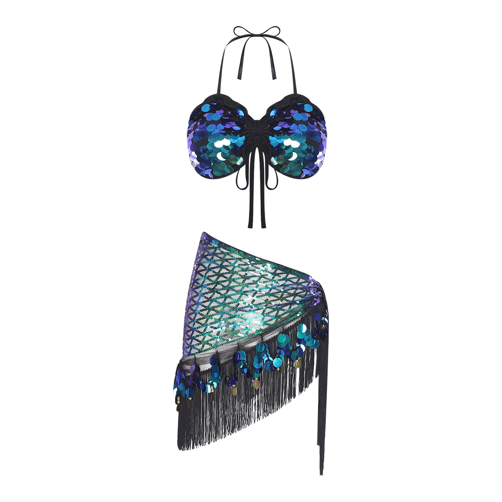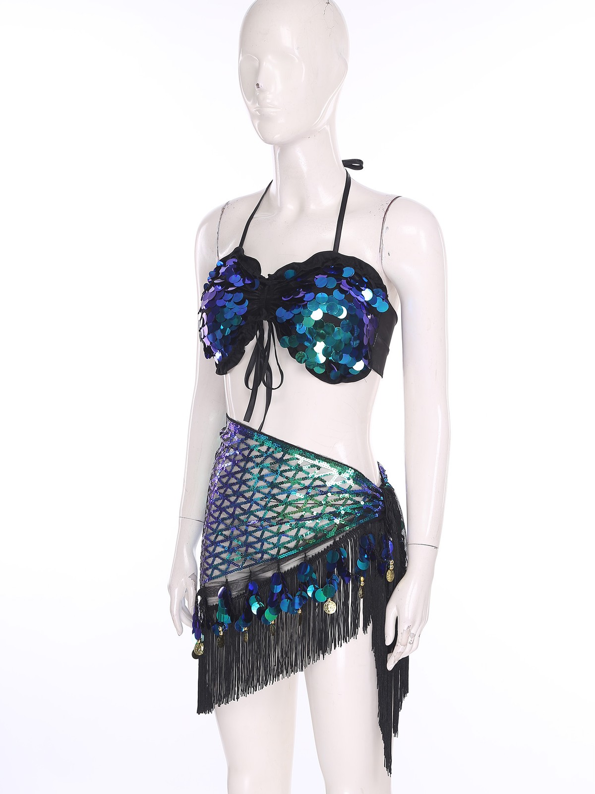 как выглядит Womens Set Stage Outfits Tassel Dancewear Triangle Shiny Carnival Dance Chain фото