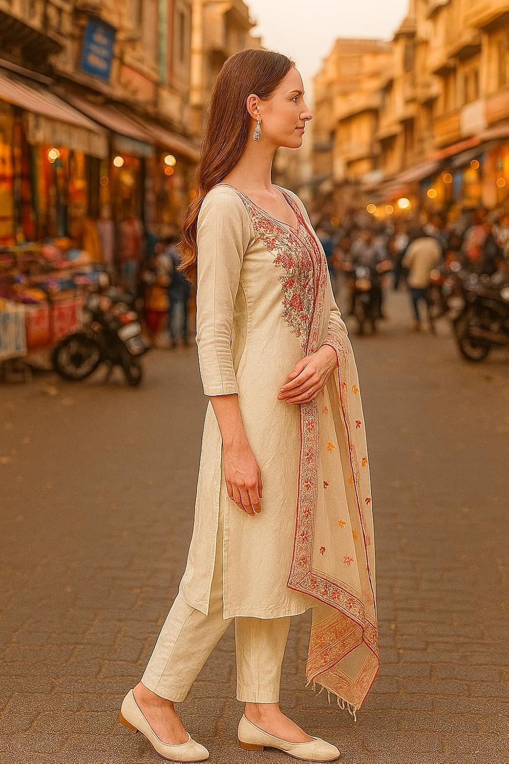 как выглядит Womens Cotton Blend Embroidered Kurta with Pant Dupatta фото