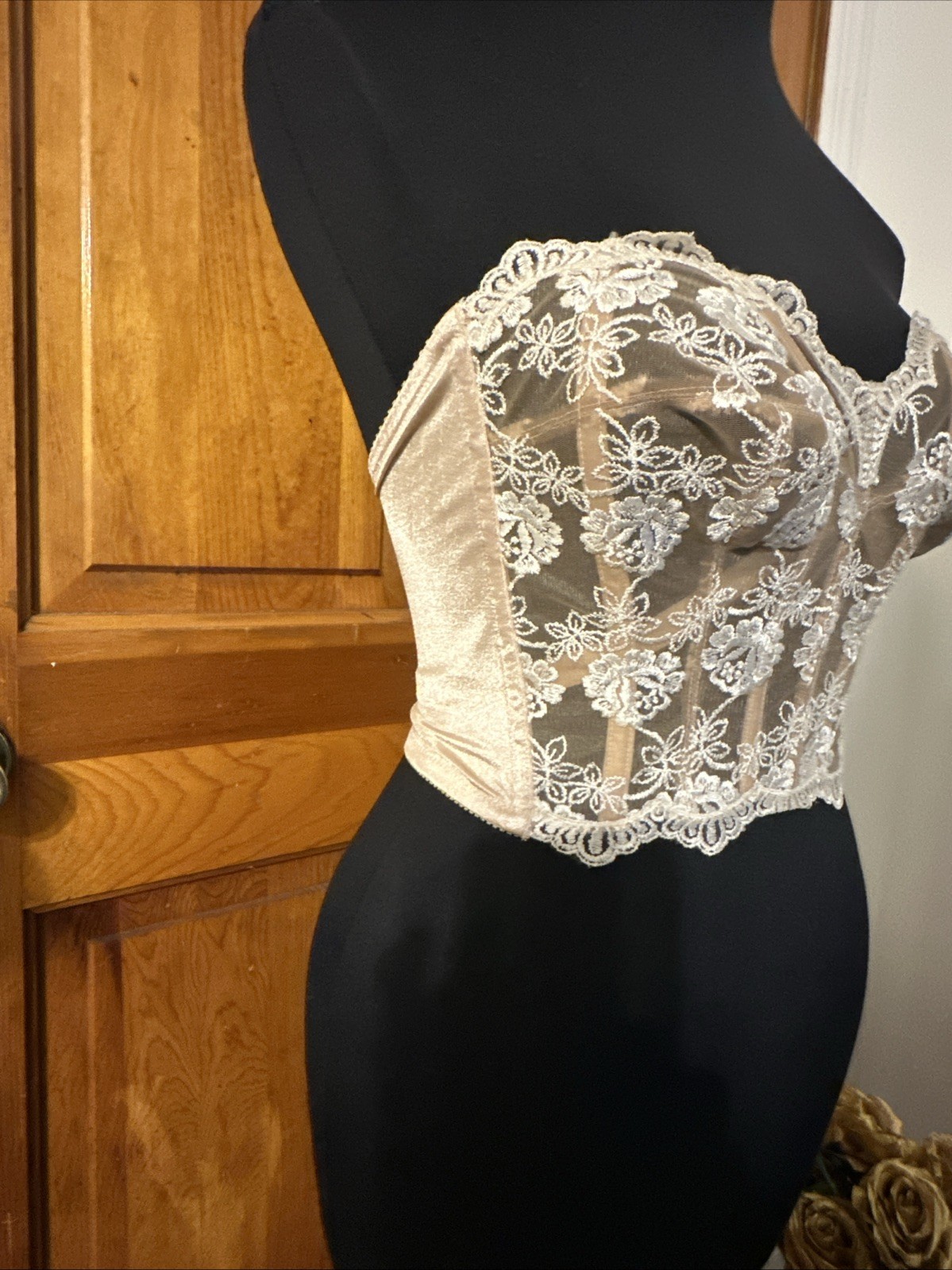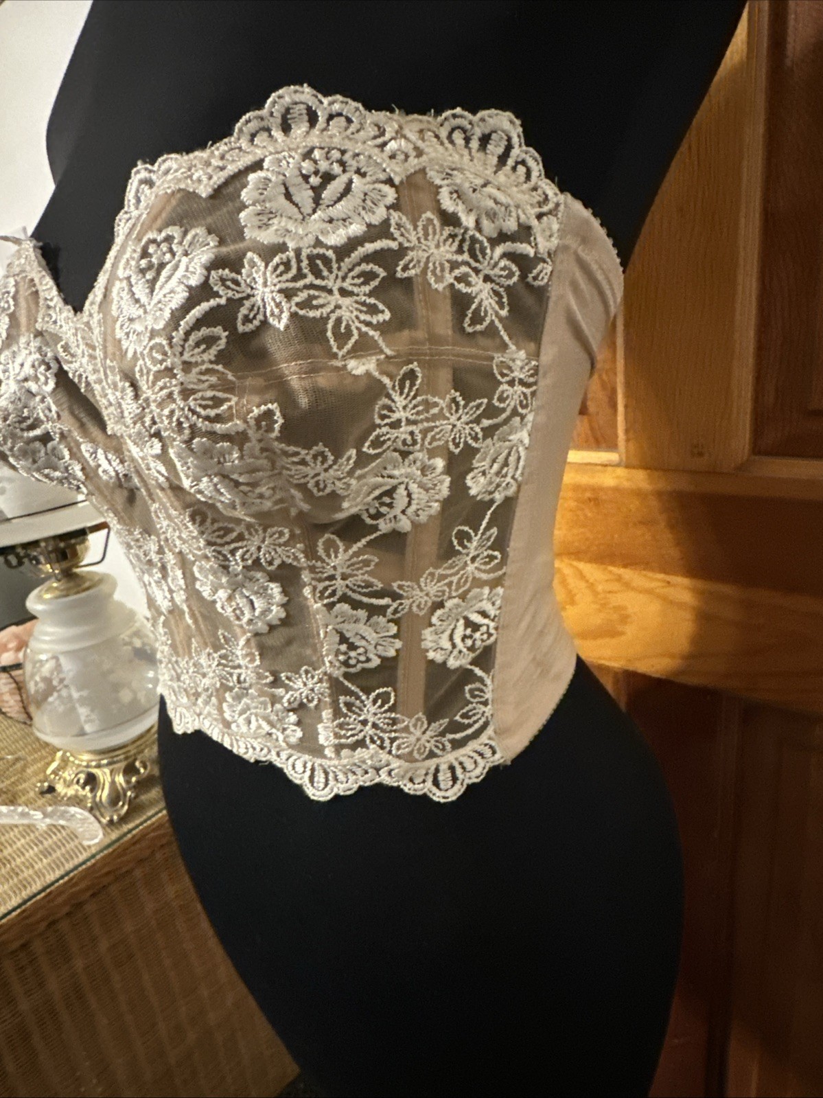 как выглядит VTG Victorias Secret Corset Tan Beige 36B white Embroidered flowers Bustier Top фото