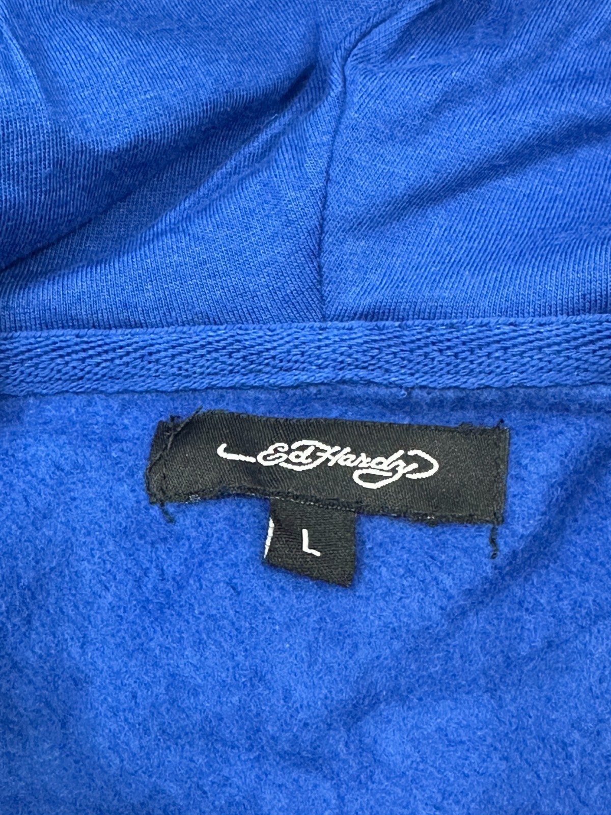 Ed Hardy Women's Size L Cobalt Blue F/Z Tiger Lotus Hoodie Cropped Sweatshirt