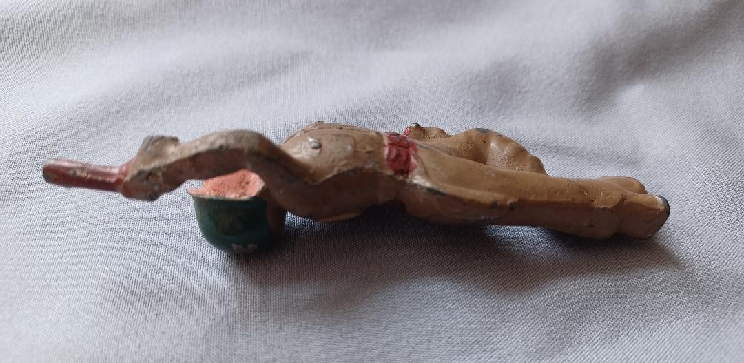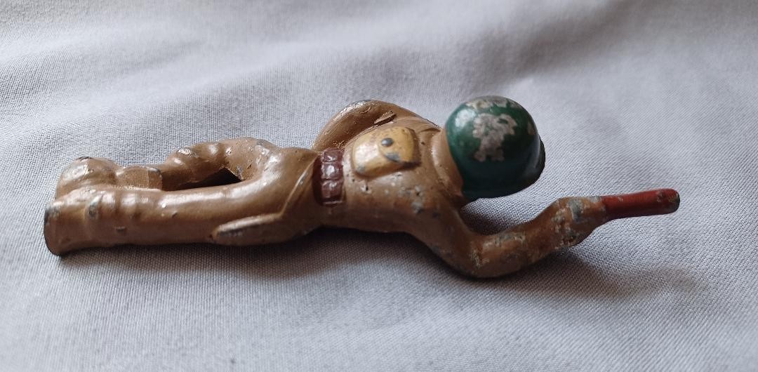 как выглядит Vintage Metal Barclay Pod Foot Soldier Laying With Pistol Green Helmet фото