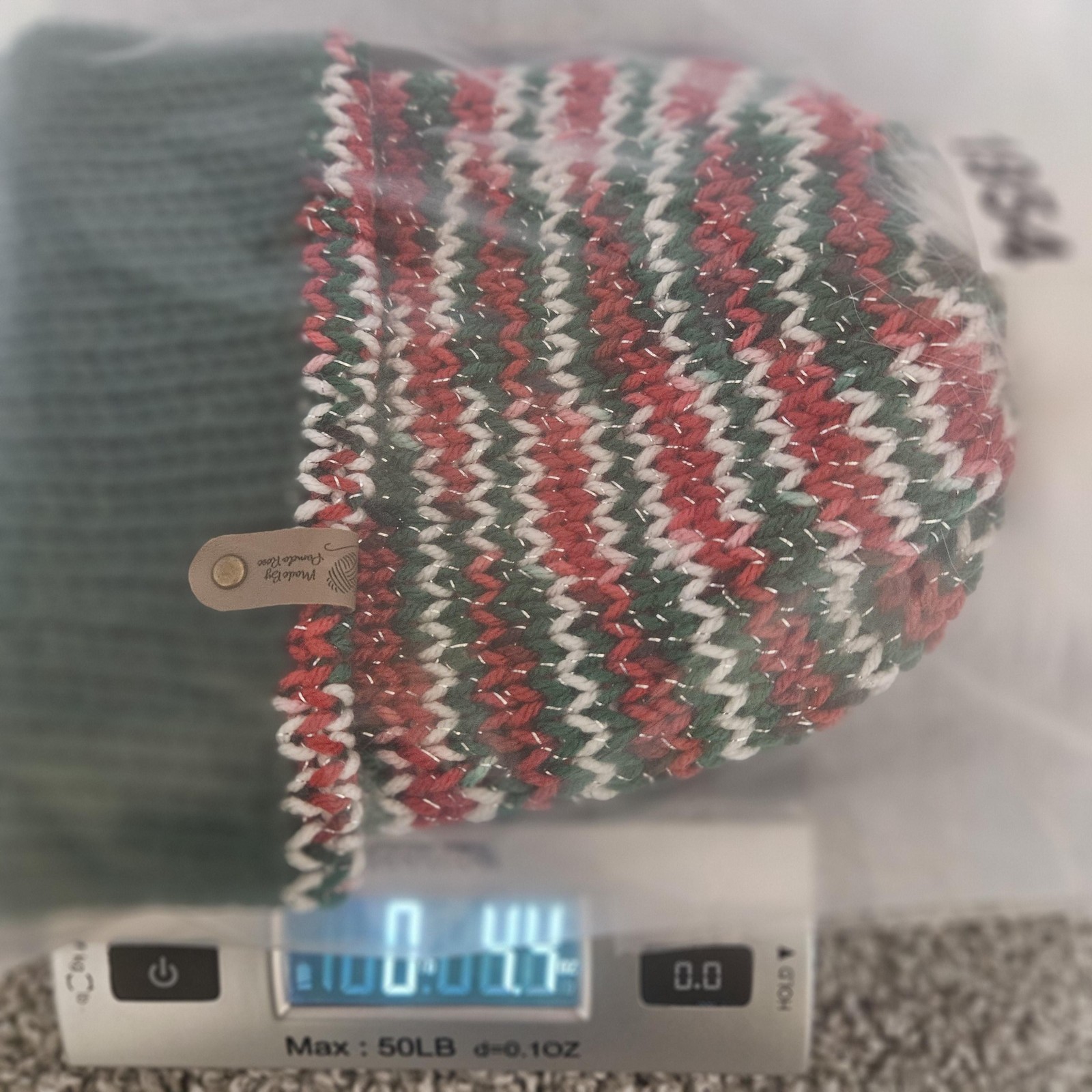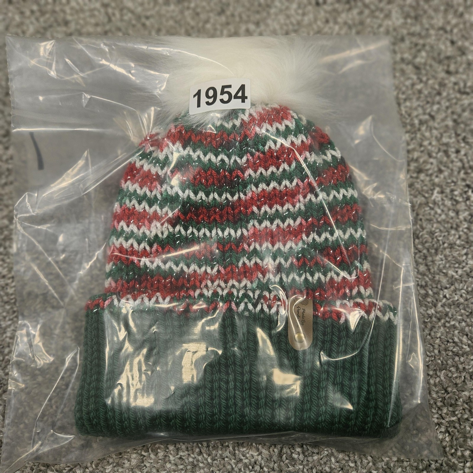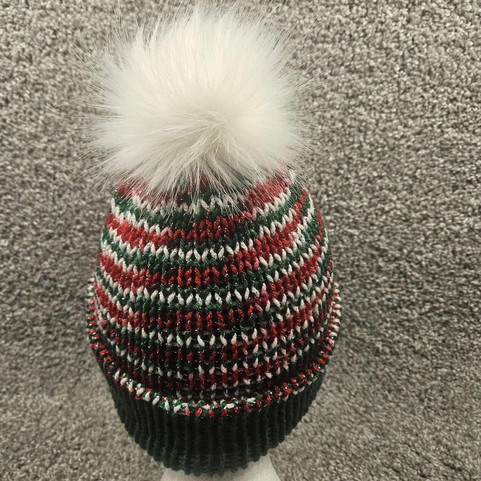 как выглядит Handmade Knit Beanie Children 4-10 yrs Green Red White Fur Pom One Size Winter фото