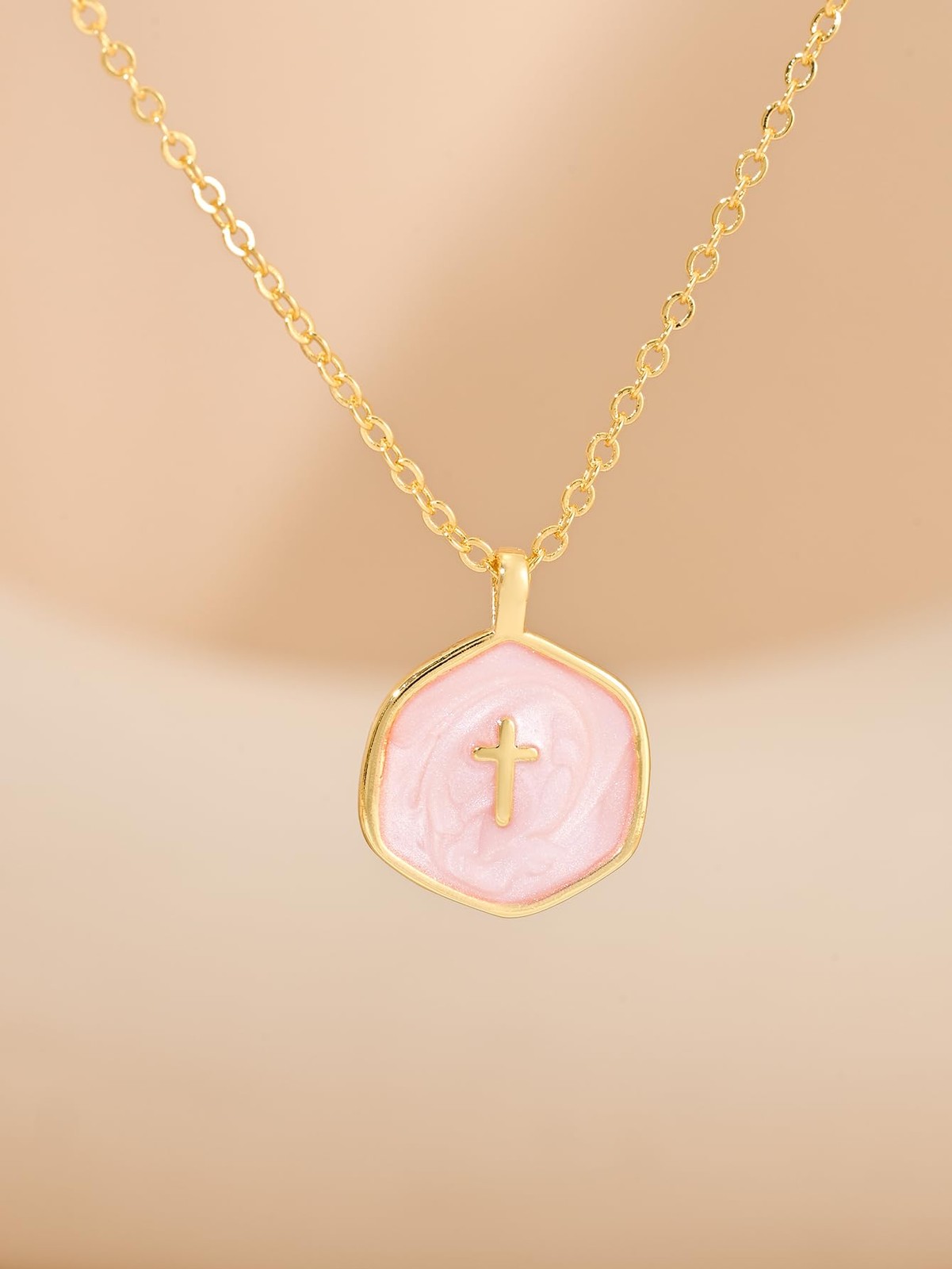 HERSIN Gold Cross Necklace for Women Trendy, Dainty 16k Plated Pink