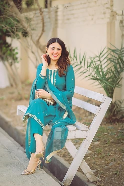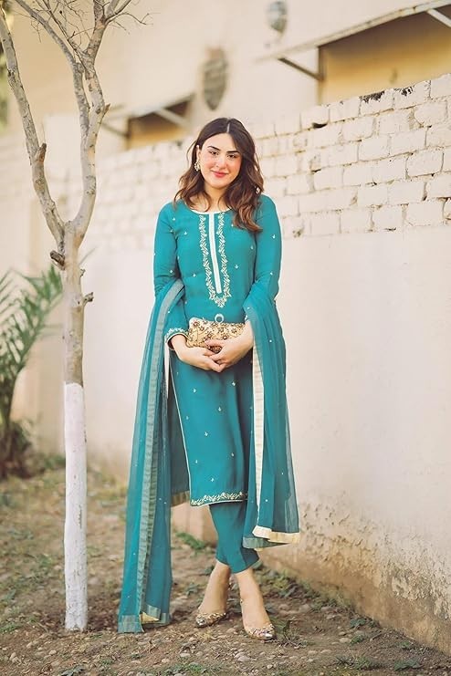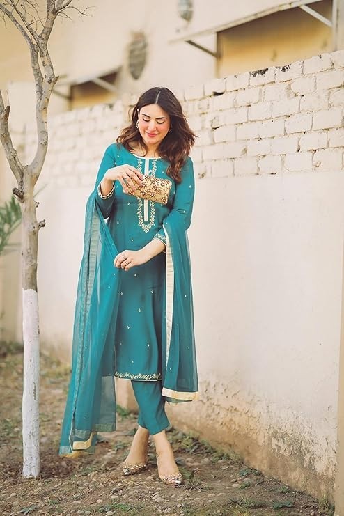 как выглядит Womens Cotton Blend Straight Embroidered Kurta with Pant Dupatta фото