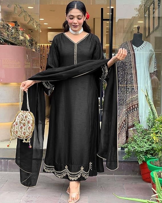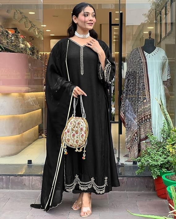 Women's Rayon Viscose Anarkali Embroidered Kurta with Pant Dupatta
