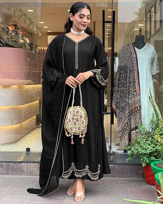 как выглядит Womens Rayon Viscose Anarkali Embroidered Kurta with Pant Dupatta фото