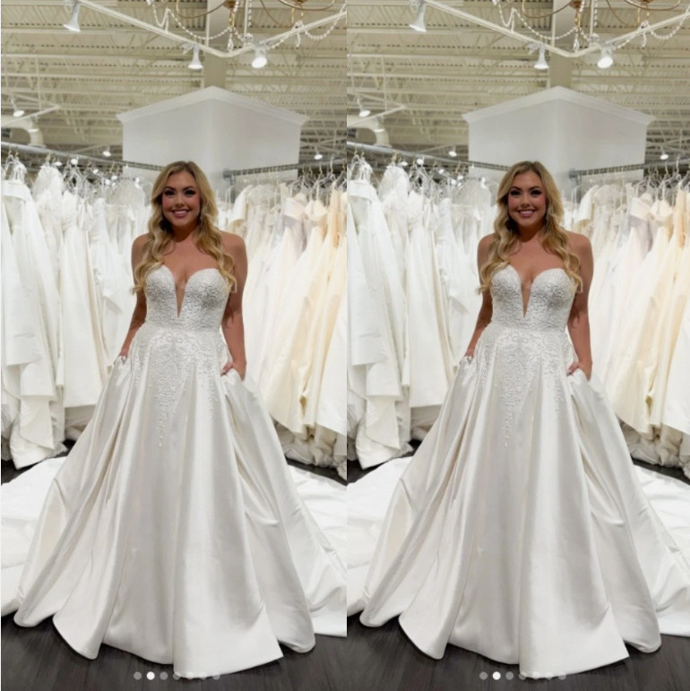 как выглядит Elegant Wedding Dresses with Side Pockets Satin V Neck Sweep Train Bridal Gown фото