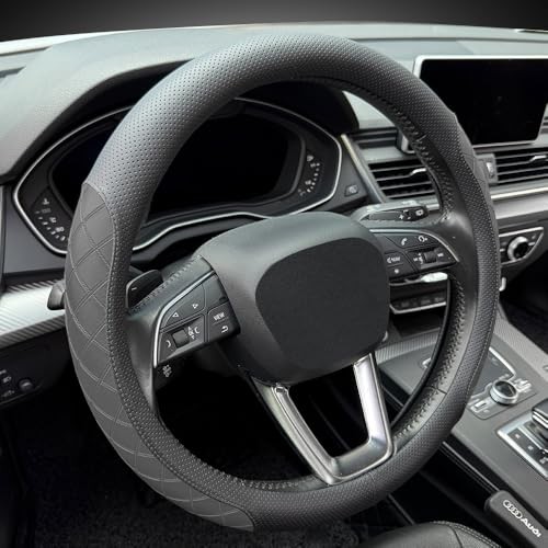 Nappa Leather Steering Wheel Cover, Elegant Diamond Checkered Design, Black